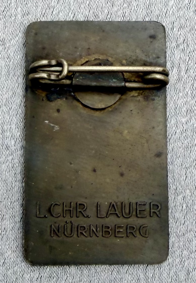 18. Bayer Turnfest Nürnberg 1934 Tinnie, bronze metal pinback, maker marked “L. Chr. Lauer, Nürnberg” on the reverse, 22mm X 37mm