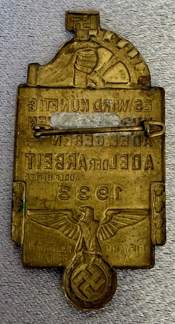 Adel der Arbeit Tinnie. Es wird künftig nur noch einen Adel geben - Adel der Arbeit - Adolf Hitler 1933. Metal pinback. 26mm x 51mm