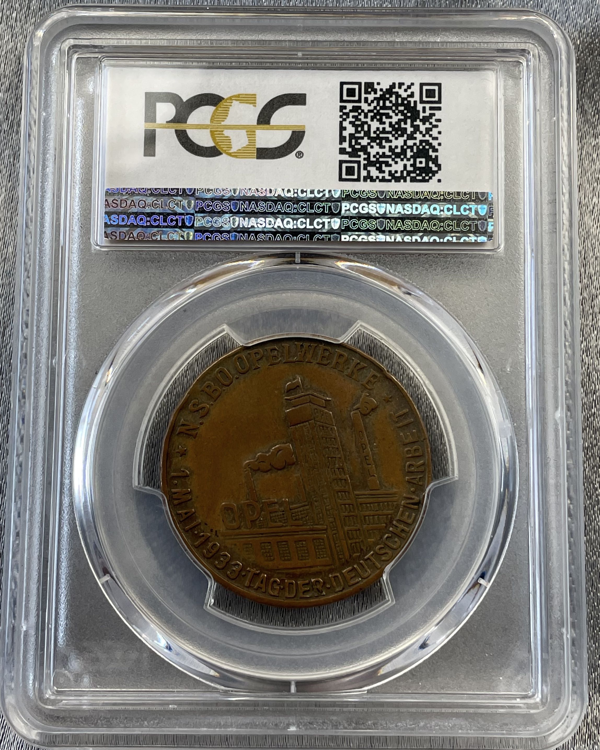 Bust of Hitler facing left. The inscription reads, "ADOLF HITLER / DER FUHRER AUS DER NOT" or "Adolf Hitler, the leader out of the hardship (want)." The reserve has the Opal factory portrayed, surrounded by the inscription, "N.S.B.O. OPELWERKE / 1. MAI. 1933 TAG DER DEUTSCHEN ARBEIT" OR "Organization of National Socialist Industrial Cells / Day of the German Worker." Struck in copper. 30mm. C-40. Graded by PCGS