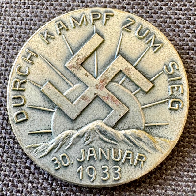 Front shows a right facing Hitler, reverse shows sunrise view a mountain view and Swastika rising, reads "Durch Kampf zum Sieg 30. Januar 1933". This one is not listed in the Colbert-Hyder book, 30.5mm, uncommon