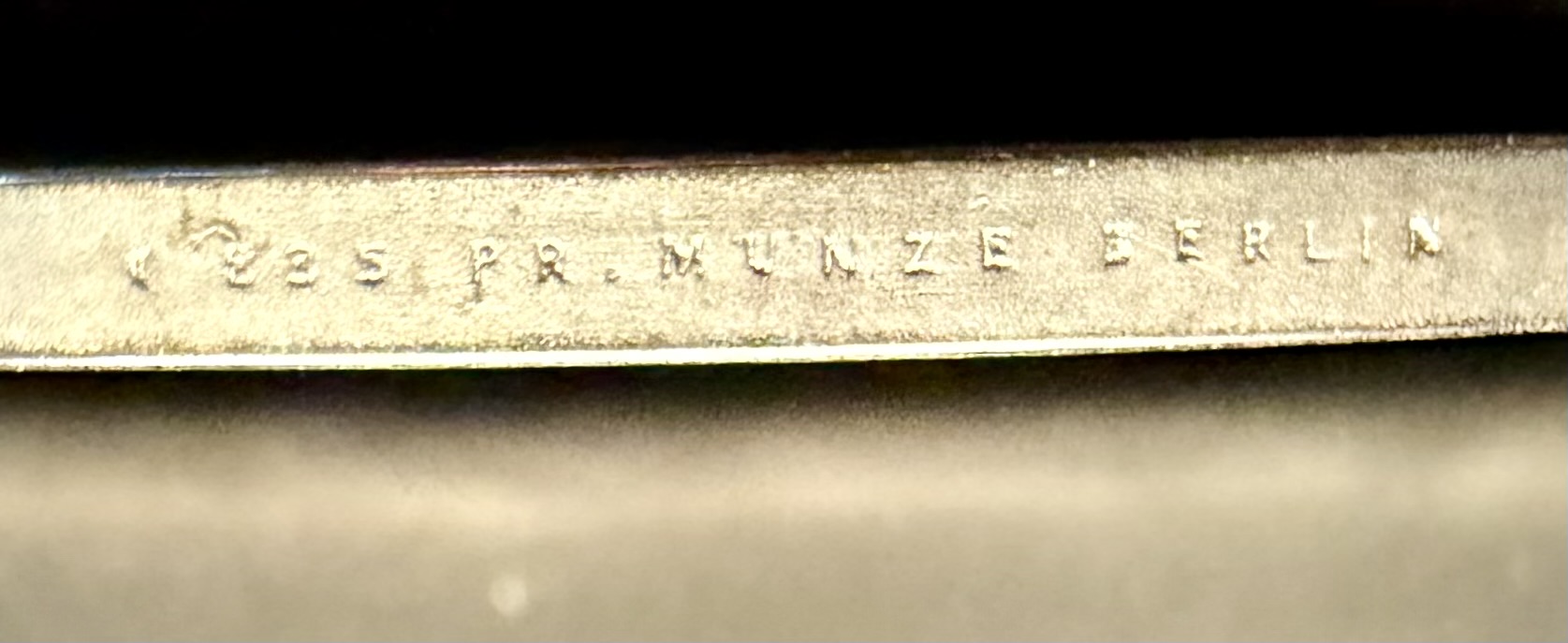 Adolf Hitler Medallion. Bust of Hitler facing left with artist signature and date on the lower right: "Krischker 1939". Reverse in German translates: "50 years ago on April 20, 1889 our leader, Adolf Hitler, creator of the greater German empire, was born". Struck in silver, bottom edge marked "835 PR. MÜNZE BERLIN" with the 1/2 moon symbol proceeding, 60mm. With original period box. C-117 in the Colbert-Hyder book.