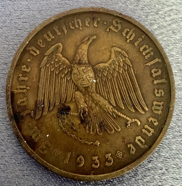Adolf Hitler Medallion. Bust of Hitler facing left surrounded by inscription in German, "Ours the Future-Adolf Hitler". Reverse device is eagle with broken shackels and inscription in German, "In the year of the turn of German destiny, 1933". Struck in gilt plated metal. 36mm. C-30 in Colbert-Hyder book. "BAYER.HAUPTMUNZAMT" stamped into side.
