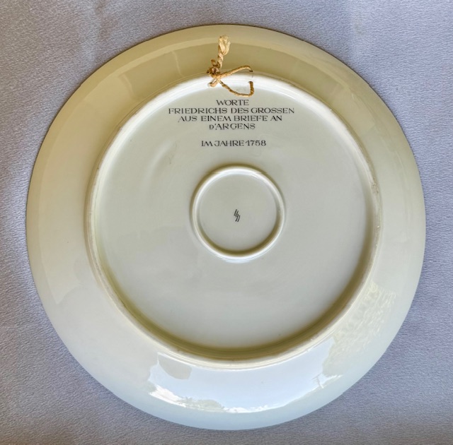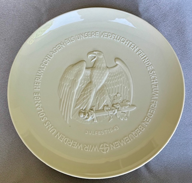 Allach Porcelain 1943 Juhlfest Plate. A very nice mint, undamaged, never repaired Julfest plate for 1943, measuring approx. 10 inches. Himmler Presentation Julfest 1943 plate, presented to parties on his personal lists and to illicit favors. Rear of plate bears the quote from Frederick the Great which translates to "We have to fight our enemy until they surrender for peace", allach maker marked as shown