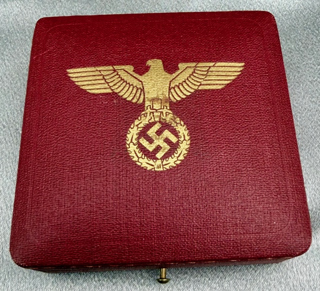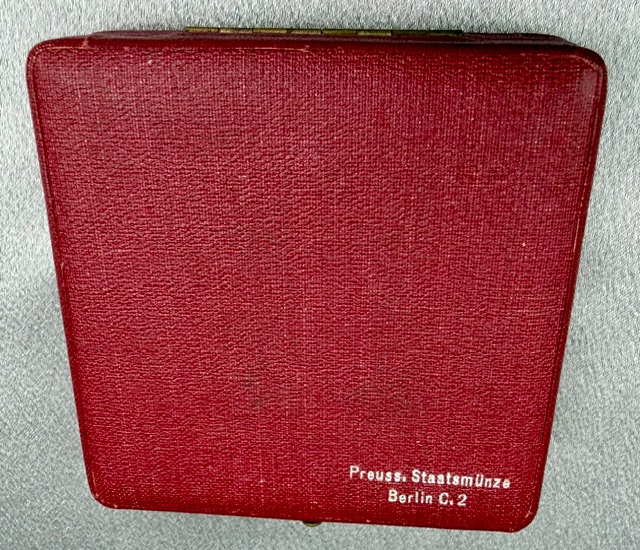 Cased bronze medallion, 50mm. Obverse shows an eagle and swastika, reverse is inscribed "Für Besondere Leistungen in der Tierzucht Reichsminister für Ernährung und Landwirtschaft ". Cased has eagle and swastika to teh front, reverse is maker marked "Preuss. Staatsmünze Berlin C.2"