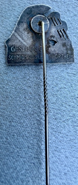 Baden Singers' Association Membership Stickpin, reverse marked "Ges Gesch Schmidhäussler Pforrzheim", approx. 23mm X 20mm