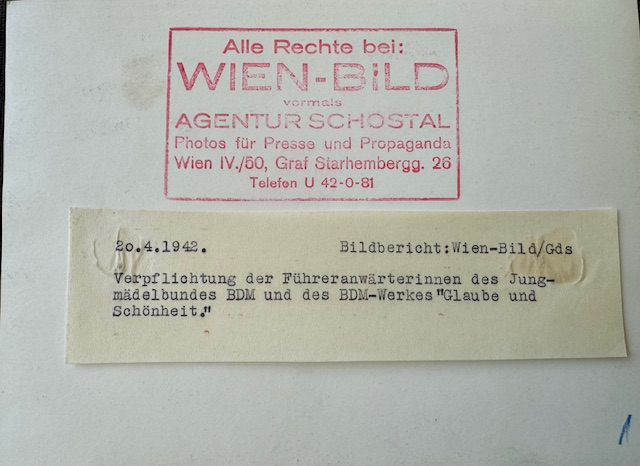 Commitment of the female leaders to the BDM Young Girls' League and the BDM organization "Faith and Beauty" on April 20, 1942, press photo, approx. 5" X 7" in size