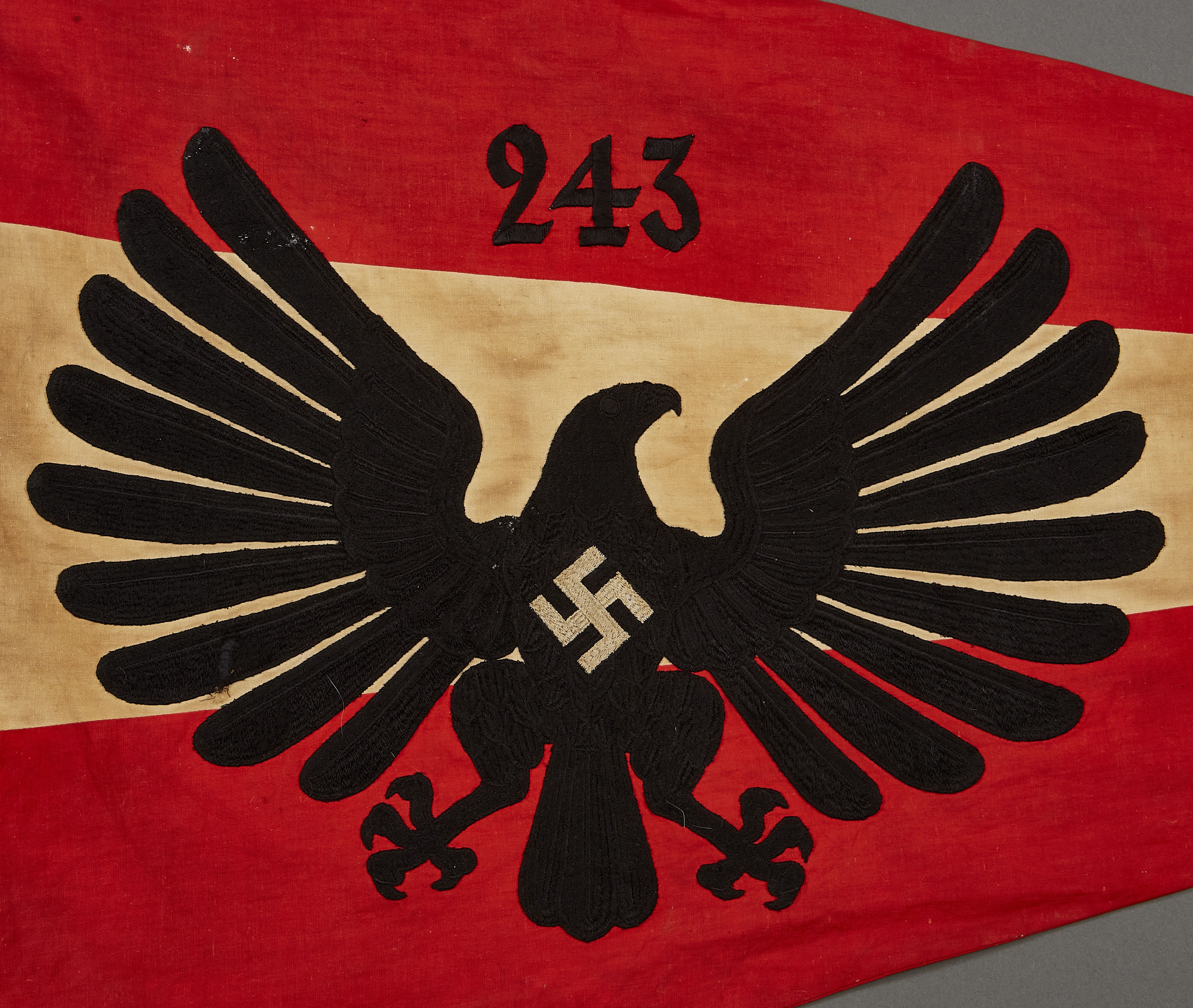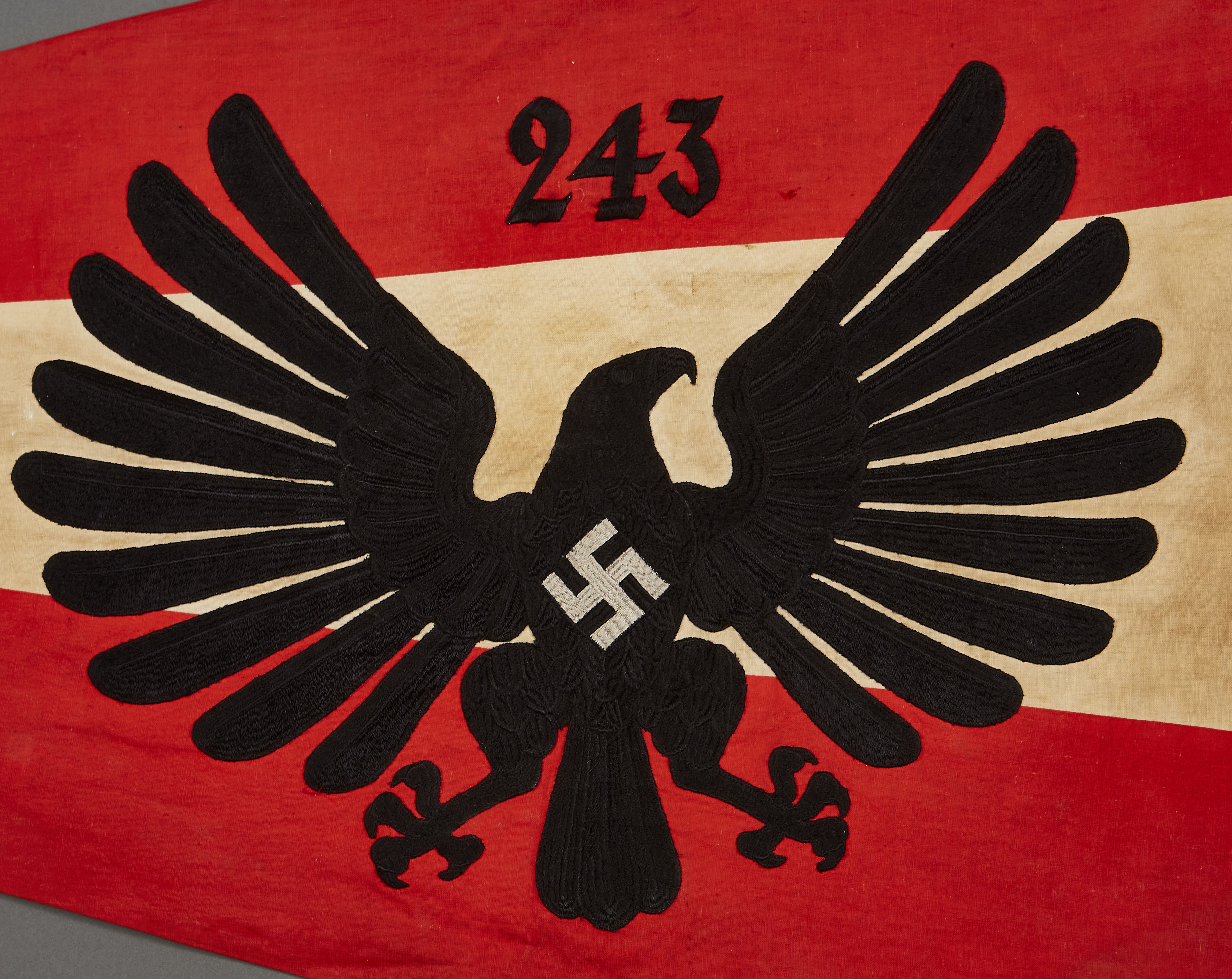 BDM Untergau Pennant for 243 which is West-Westfalen in Neuwied. Excellent condition, heavy embroidery 2 clips missing, approx. 30" X48" in size