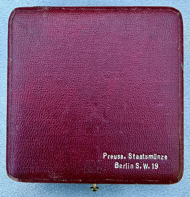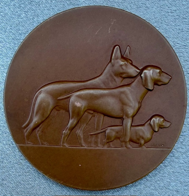 Rare cased "Für züchterische Leistungen" table medallion for dog breeding. The obverse shows an eagle with swastika surrounded by the inscription: "Der Reichsminister für Ernährung und Landwirtschaft - Für züchterische Leistungen" and the artists name "Scheurich". The reverse shows a nice image of three dogs with the artist name "Brasch". The bronze medallion is 50mm. The original case shows a large NS eagle and swastika on front, the reverse is nicely marked "Preuss.Staatsmünze Berlin S.W.19".