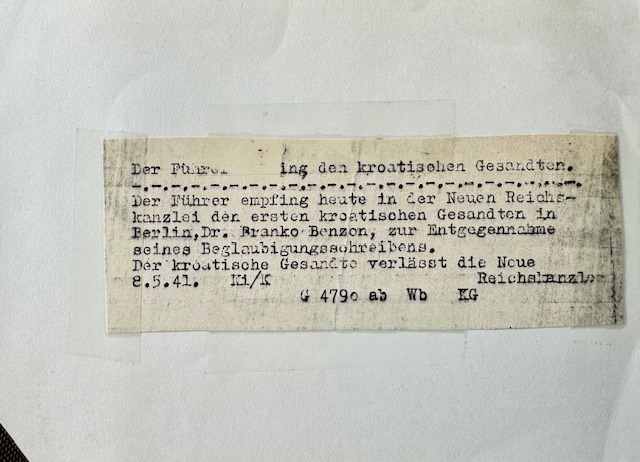Croatian ambassador Dr. Franko Benzon at the New Reich Chancellery in Berlin on May 8, 1941. Print of press photo, approx. 7" X 5"