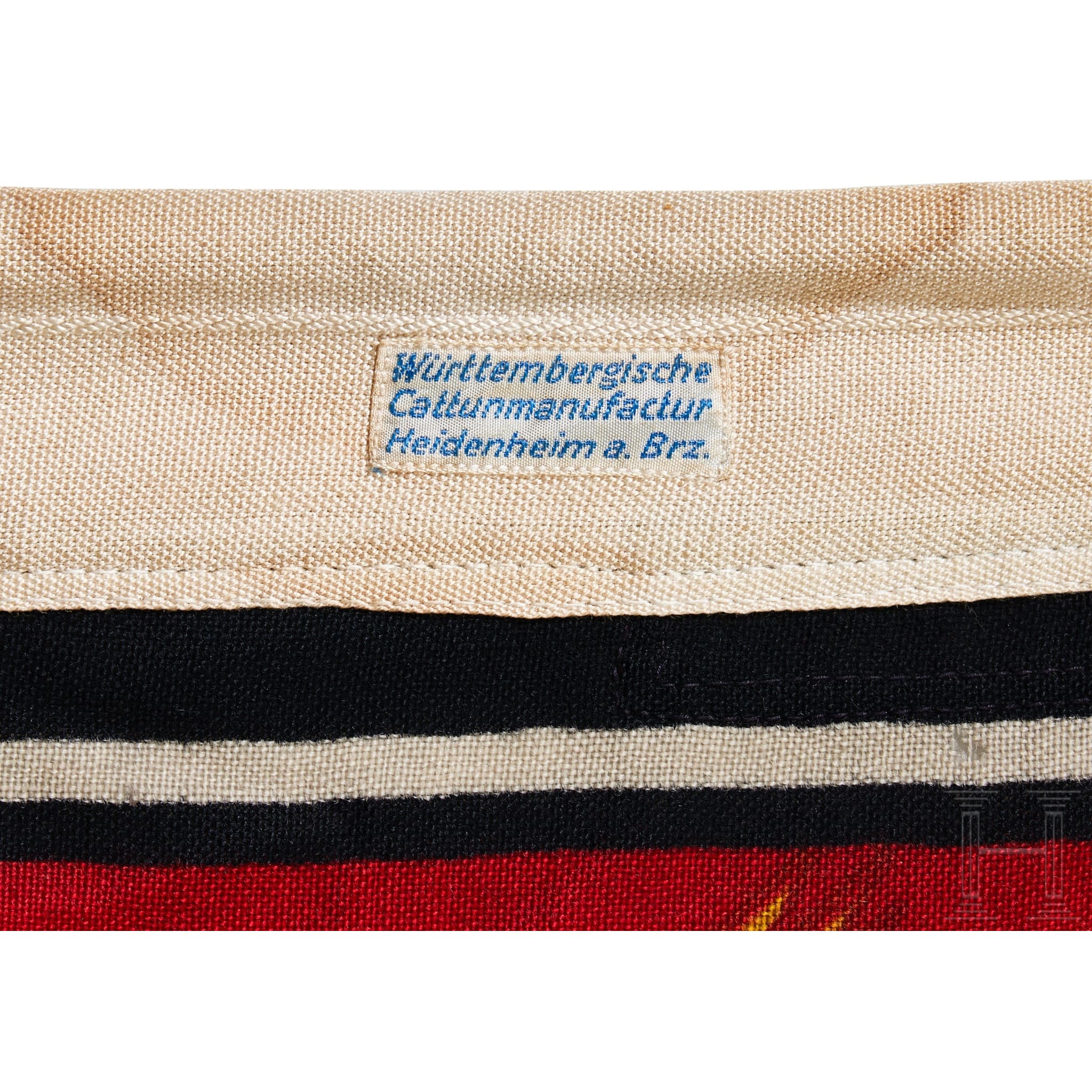 A Führer and Reich Chancellor’s Standard. Dual sided, woven linen standard with a printed image. Red base field with black/white/black outer border trim. Centered on the red field is a white circular field with a black static swastika with a white and black striped outer border, encompassed by a golden yellow circular oak leaf wreath with tan accents. Each corner of red field has a golden yellow eagle with the Wehrmacht styled eagle with down swept wings to the upper right and lower left corners and a political style national eagle outstretched wings to the opposite two corners.Image is identical to both sides. White bunting hoist edge has a tunnel looped suspension rope with stitched attachment loops to both the top and bottom corners. Hoist edge bunting is well marked with black ink stamped designation abbreviation that appears to be “Stand. d.Führers Gr.1”, and dimensions in centimeters,“50 x 50”. White bunting hoist edge also has a white rayon tag with blue machine woven manufacturer's name and location, “Wurttembergische Cattunmanufactur Heidenheima. Brz.”. The standard is in overall very good condition with some small minor holes and minor age and usage toning. Scarce!