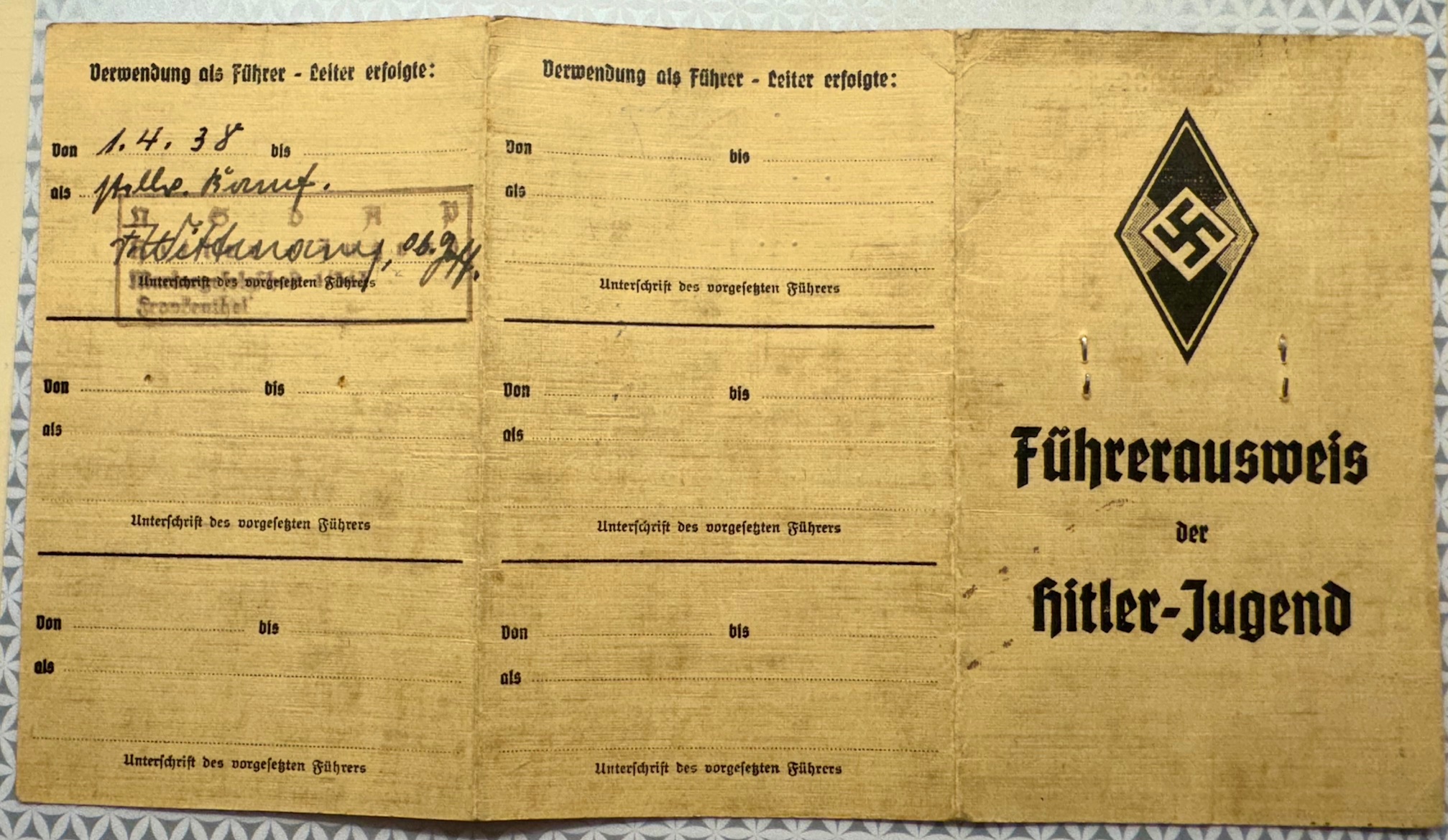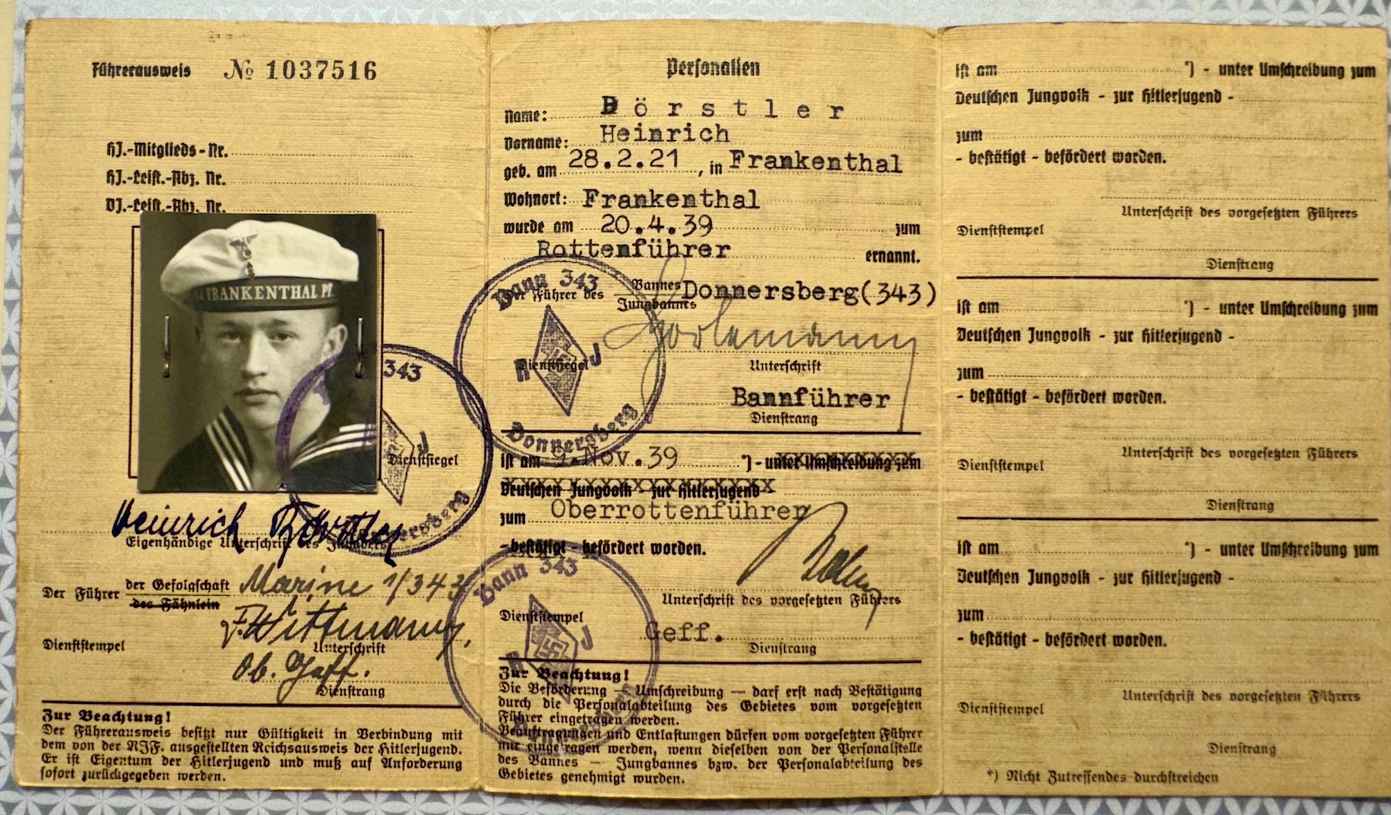 Führerausweis der Hitler-Jugend issued on Nov 1, 1939 to HJ Rottenführer Heinrich Börstler of Bann 343, picture shows him wearing HJ summer Tellermütze "Donald Duck" cap with Frankenthal Mützenband and Marine collar.