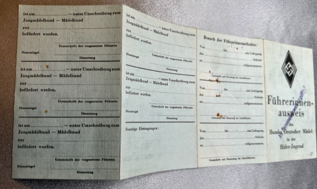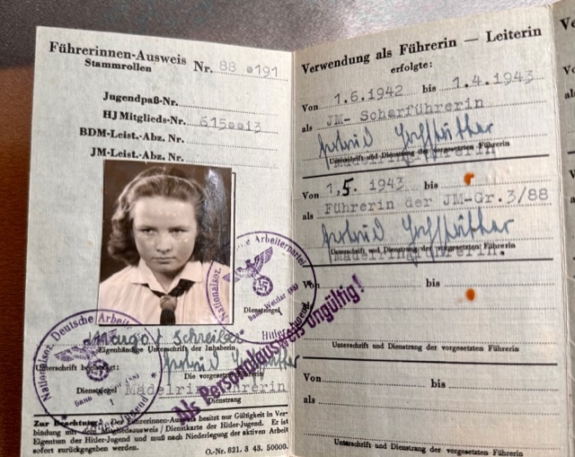 Führerausweis des Bundes Deutscher Mädel in der Hitler-Jugend for Margot Schreiber marked Als Personalausweis ungültig (invalid as an ID card)