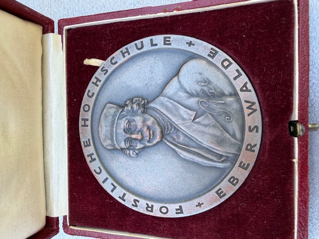 The front of the medallion shows a portrait of Friedrich Wilhelm Leopold Pfeil (1783-1859), German forestry scientist, with the inscription "Forstliche Hochschule Eberswalde" (Eberswald Forestry University). The reverse is inscribed "Für Sportliche Leistungen Klaus Abel III Sieger Hochschulsportfest 1. Triemester 1940" (For sporting achievements Klaus Abel III winner University Sports Festival 1st term 1940). Metal, 70mm, 104 grams, original case with maker mark "Robert Neff Berlin Bülowstr. 101."