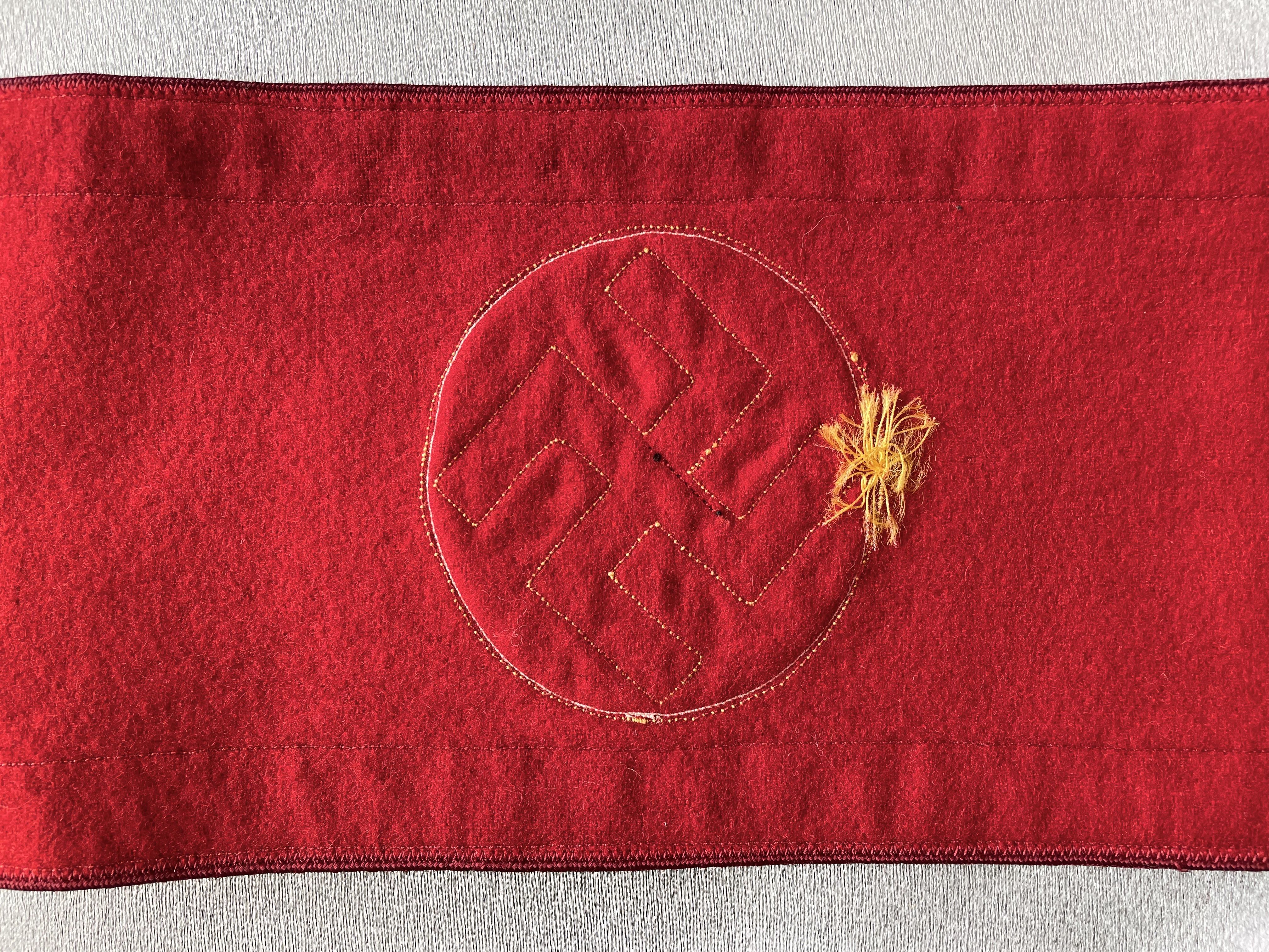 Armband for Gauleitung Leiter eines Amtes. Bullion oakleaves with black ribbon swastika surrounded by gold braid. Approx. 20" in length, choice condition