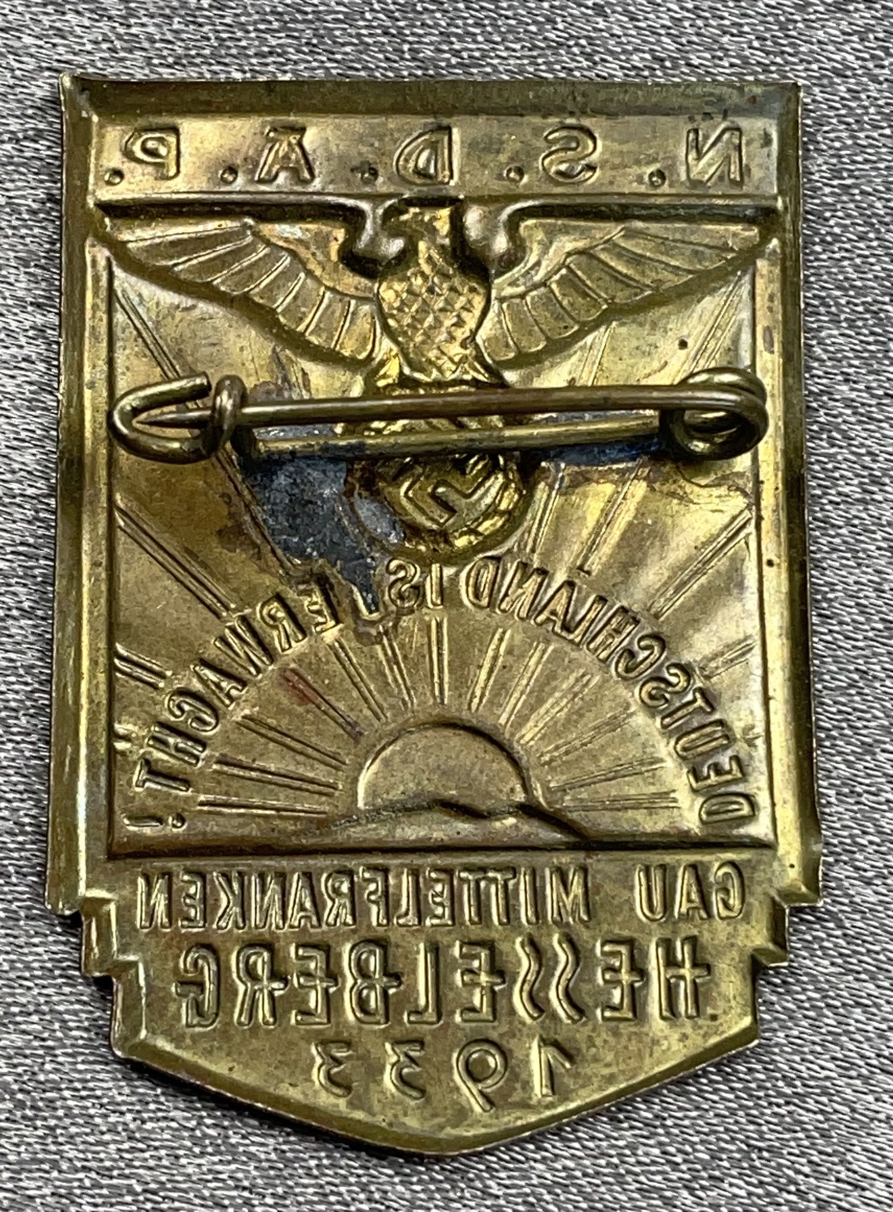 N.S.D.A.P. Deutschland ist Erwacht! Gau Mittelfranken Hesselberg 1933 Tinnie. Metal pinback.