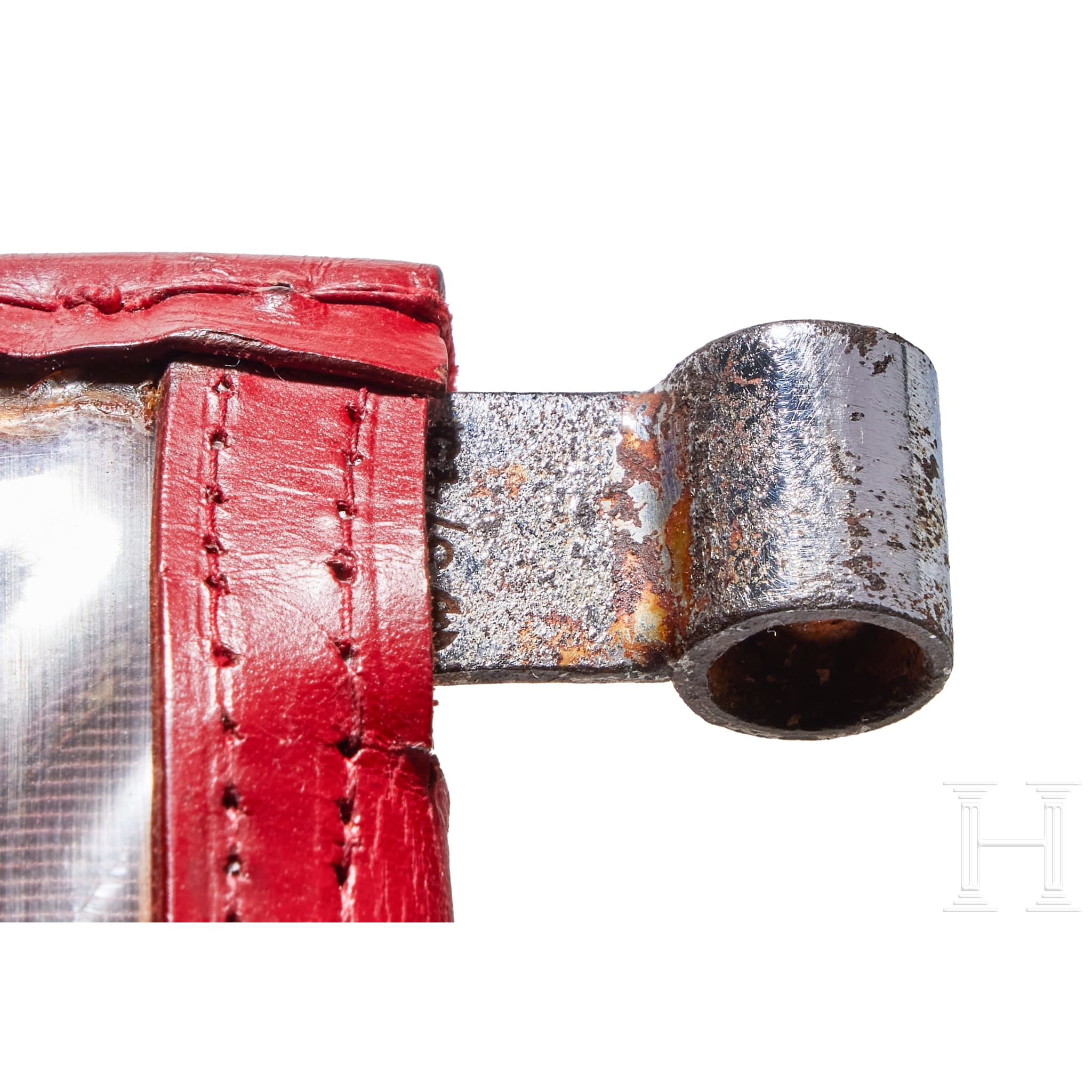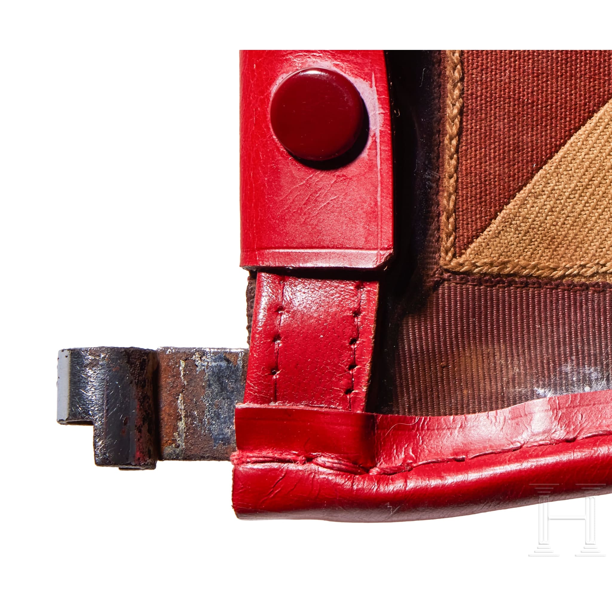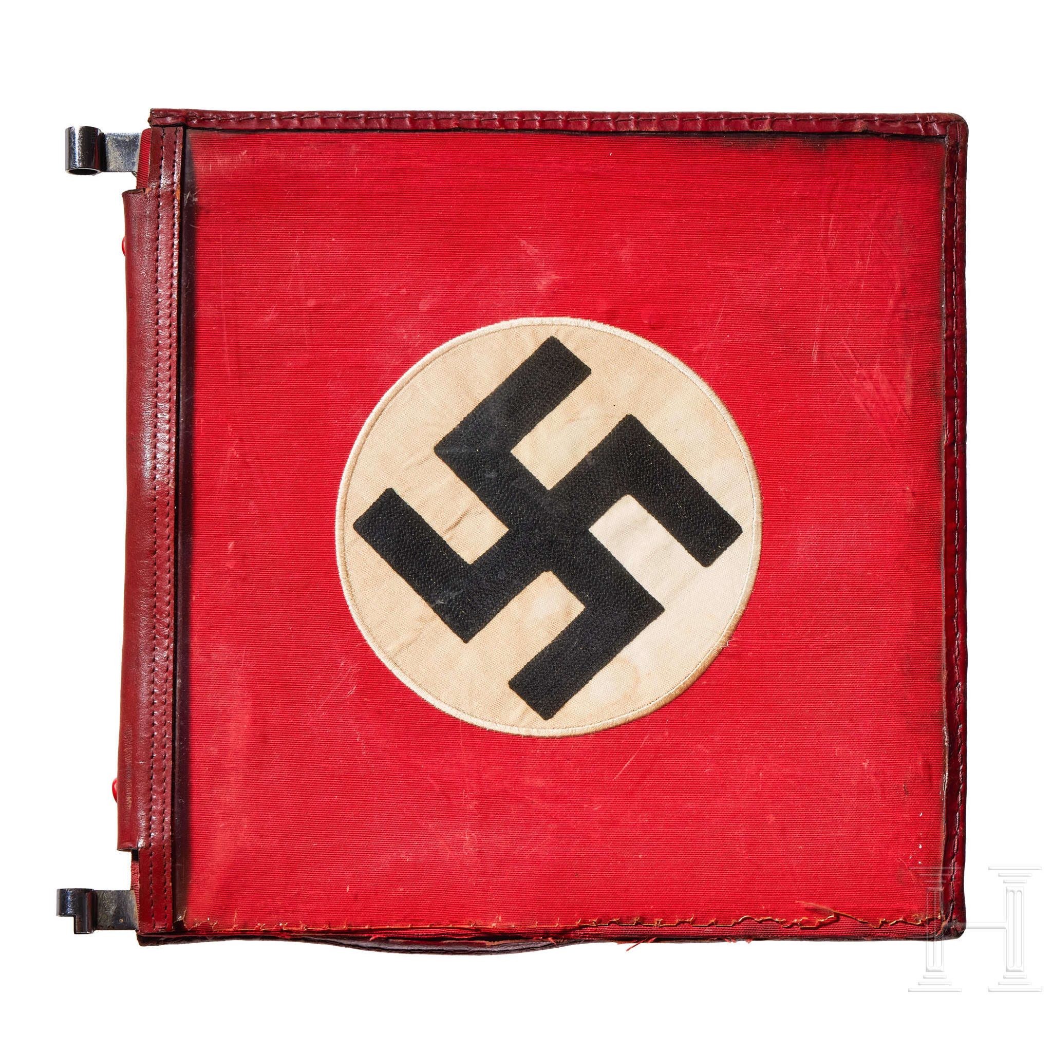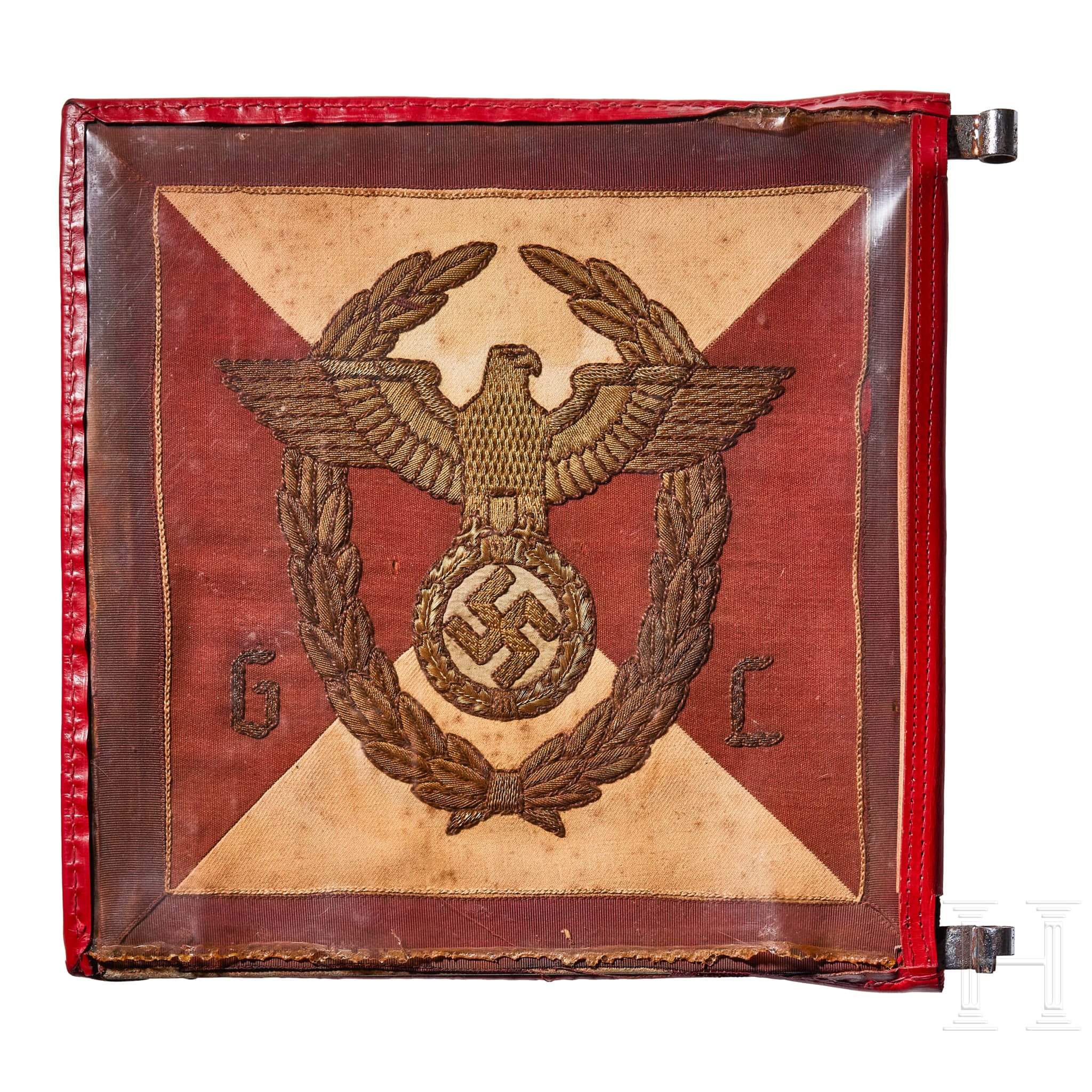 Two-sided, multi-piece construction of triangular red and white sections, bordered in dark red. A hand-embroidered gold wire eagle and full wreath flanked by the letters “G“ and “L“. Two-sided red ribbed fabric with chain-stitch embroidered swastika at center. Both on original metal frame with clear foul weather protective cover, trimmed in red leather with five-button snap closure and two nickel-silver sleeves for attachment to pole, marked RZM and “3/45“. Some damage to plastic at bottom edges. Flags have moderate soiling and metal frames have worn through fabric on bottom. Size of each Approx. 30 x 30 cm.