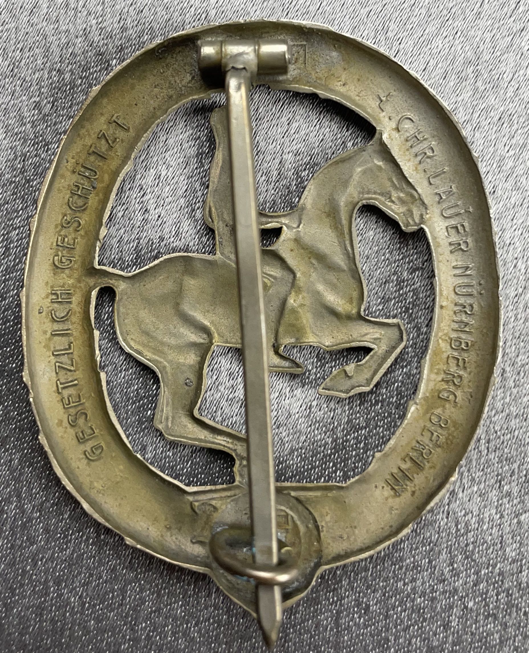 German Rider's Badge. Hollow back, maker marked.