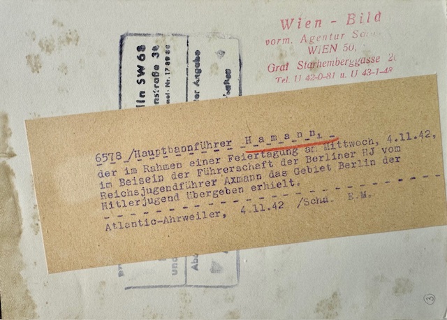Hauptbannfürer Otto Hamann Photo. Hamann was promoted to Gegeitsführer of Berlin in Nov of 1942, he was later killed in action in 1945 during the Battle for Berlin, fighting with HJ Regiment "Berlin". This press photo was taken on November 11 1942, approx. 5" X 7" in size.