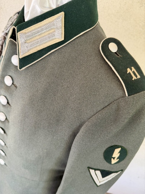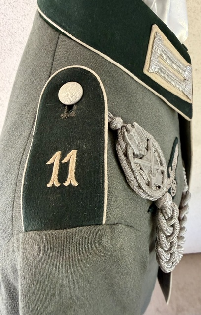 Heer Infantry Waffenrock for a OberGefrieter radio operator who served in the 11th Infantry Regiment, double acorn marksman shooting chord, maker label, named and dated 1939 inside the left breast pocket. Excellent condition