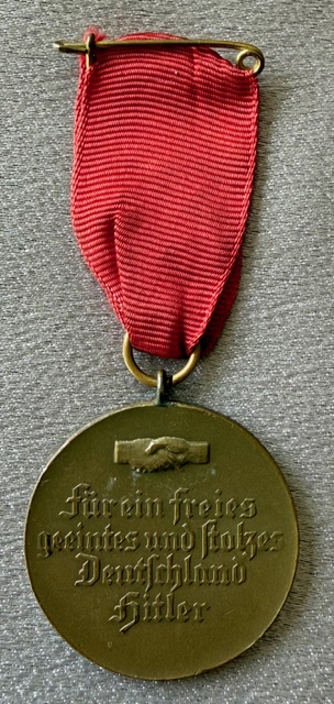 Hitler Hindenburg Medal. The front depicts Hitler and Hindenburg profiles with their names above and the dates "30.1.1933 3.5.1933" below, reverse shows 2 joined hands and reads "Für ein freies geeintes und stolzes Deutschland Hitler" (For a free, united, and proud Germany, Hitler), 30mm in diameter