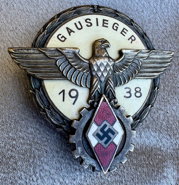 Hitler Youth 1938 Gausieger Badge for National Trade Competition (Reichsberufswettkampf), maker marked "G. Brehmer Markneukirchen", excellent condition.