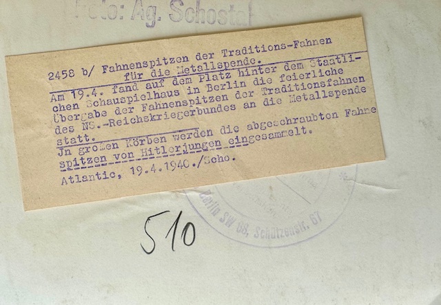 Hitler Youth collection flag tops of the traditional flags as metal donation, press photo, approx. 5" X 7" in size