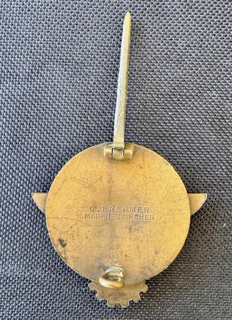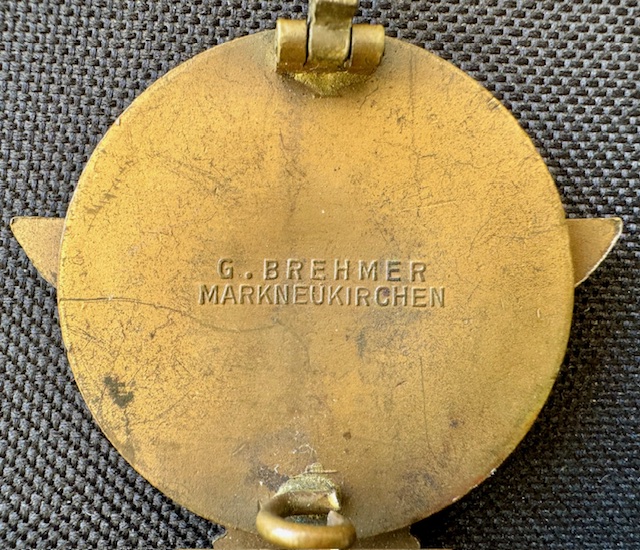 HJ Kreissieger badge, maker marked to reverse "G. BREHMER MARKNEUKIRCHEN". The badge displays the correct cream colored enameled background and details to the eagle and HJ diamond. Excellent condition.