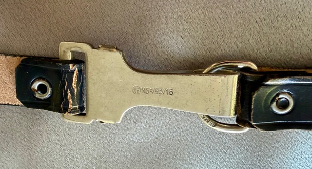 Rare HJ Black Leather Cross Strap, unissued paper RZM tag affixed, clasps are marked "RZM M5c/93/16", strap length (excluding the 2 belt loops) is approx. 31". Mint condition.