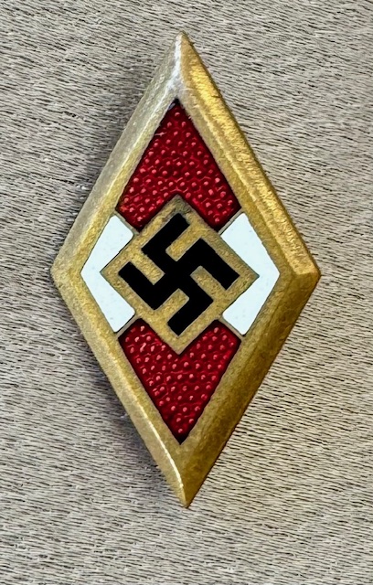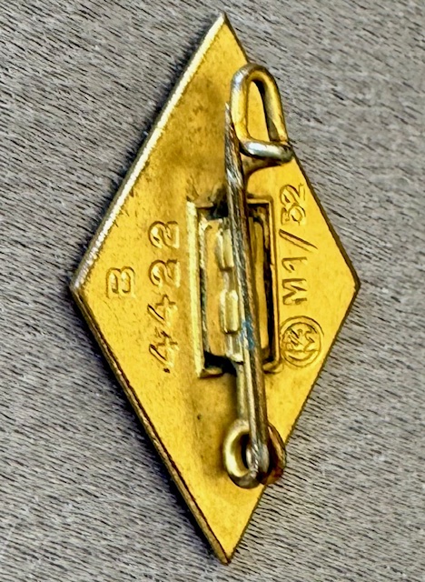 Goldenes HJ-Ehrenzeichen. Instituted August 1934 by Baldur von Schirach. (1934-1943 issue). Constructed of gilded bronze with multi-coloured enamels, the obverse bearing an HJ insignia within a gilt border, the reverse with a vertical pinback, stamped with an issue number of “B4422” and marked with a Reichszeugmeisterei (RZM) logo and maker code “M1/52” for Deschler & Sohn, Munich, measuring 17.19 mm (w) x 29.46 mm (h)