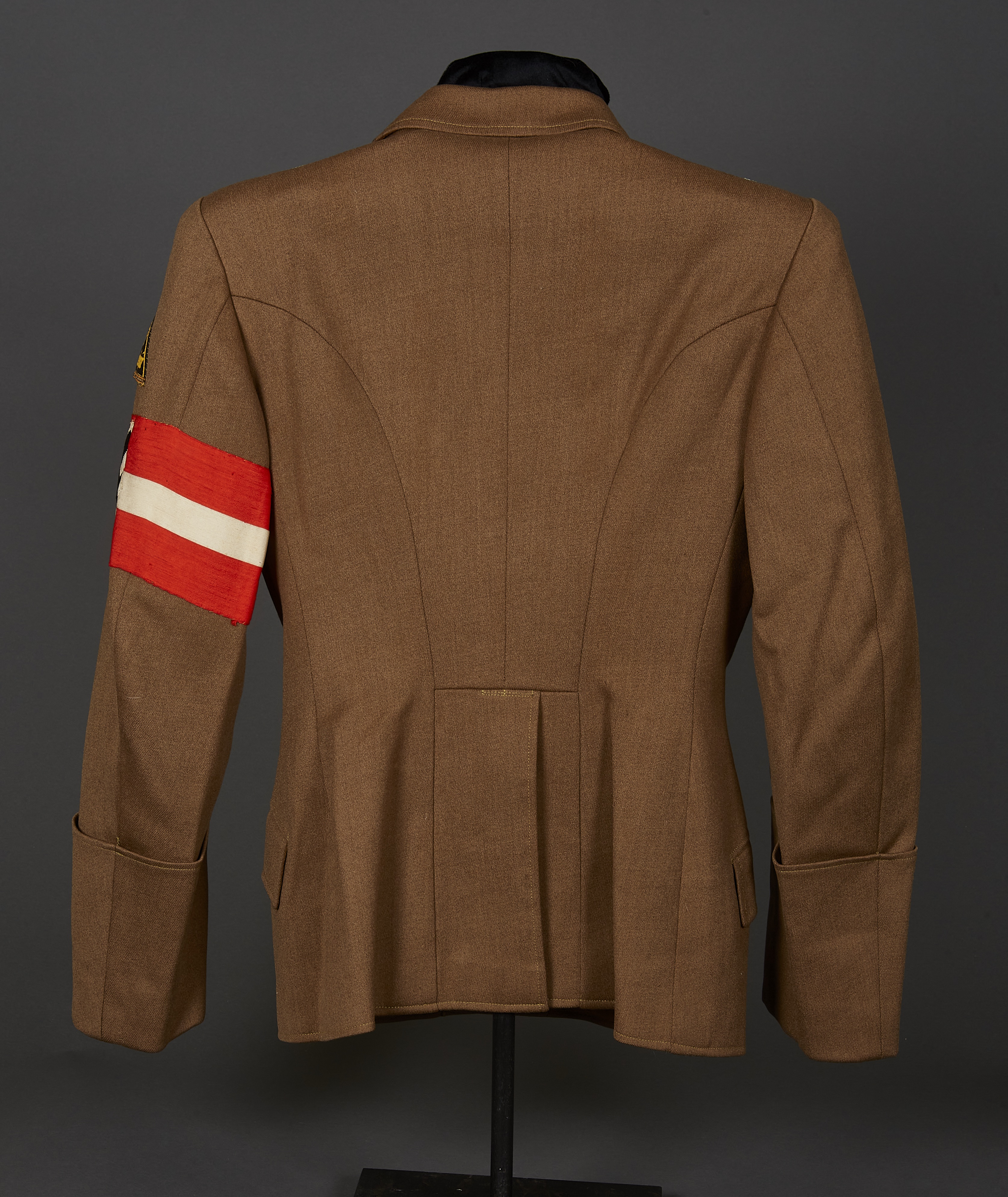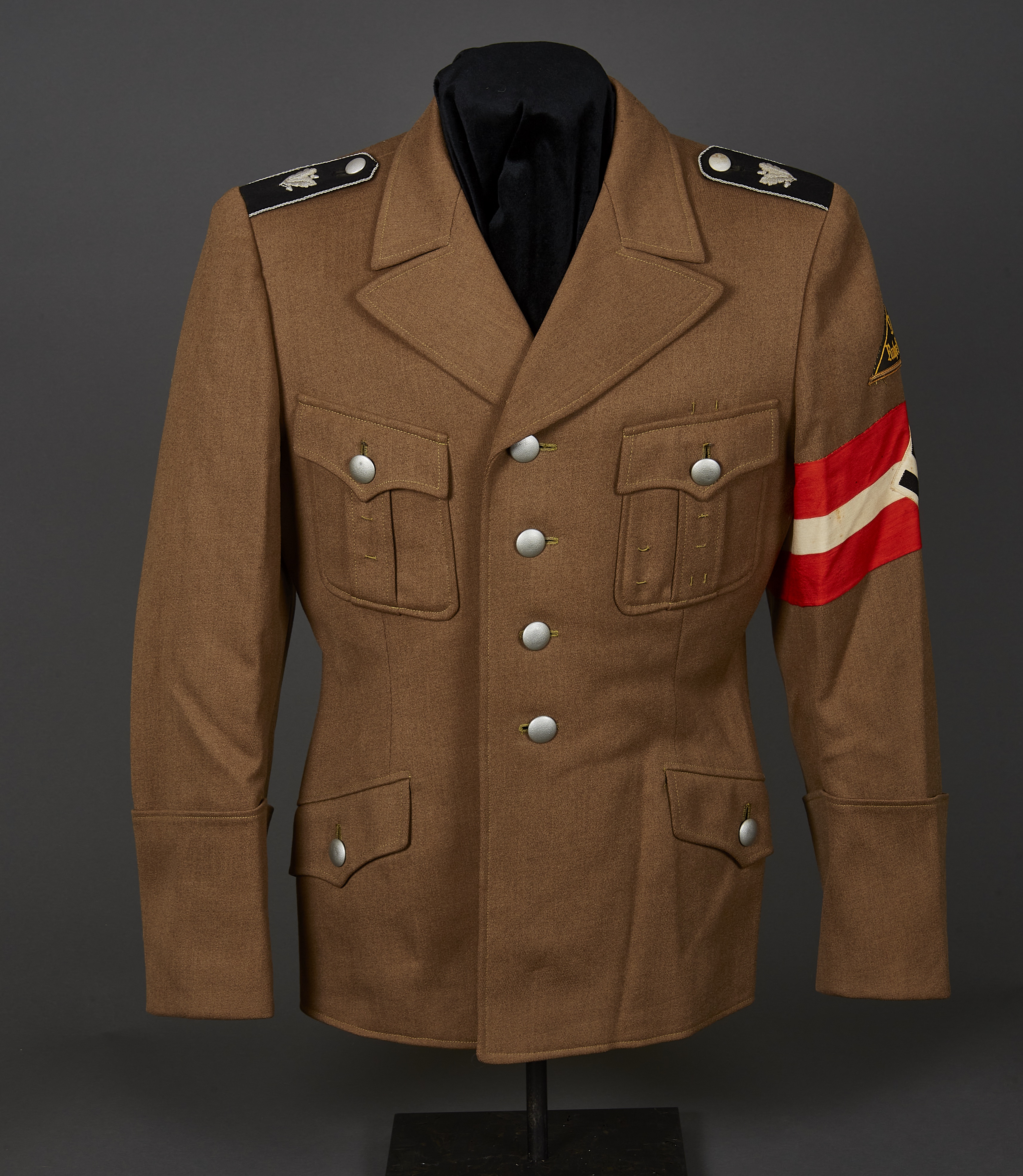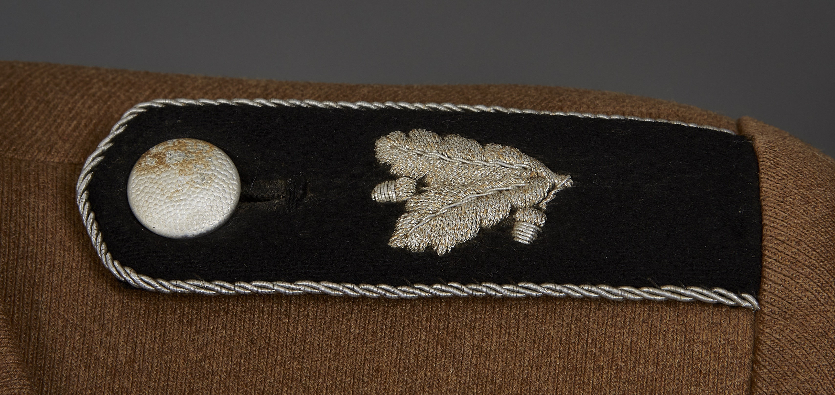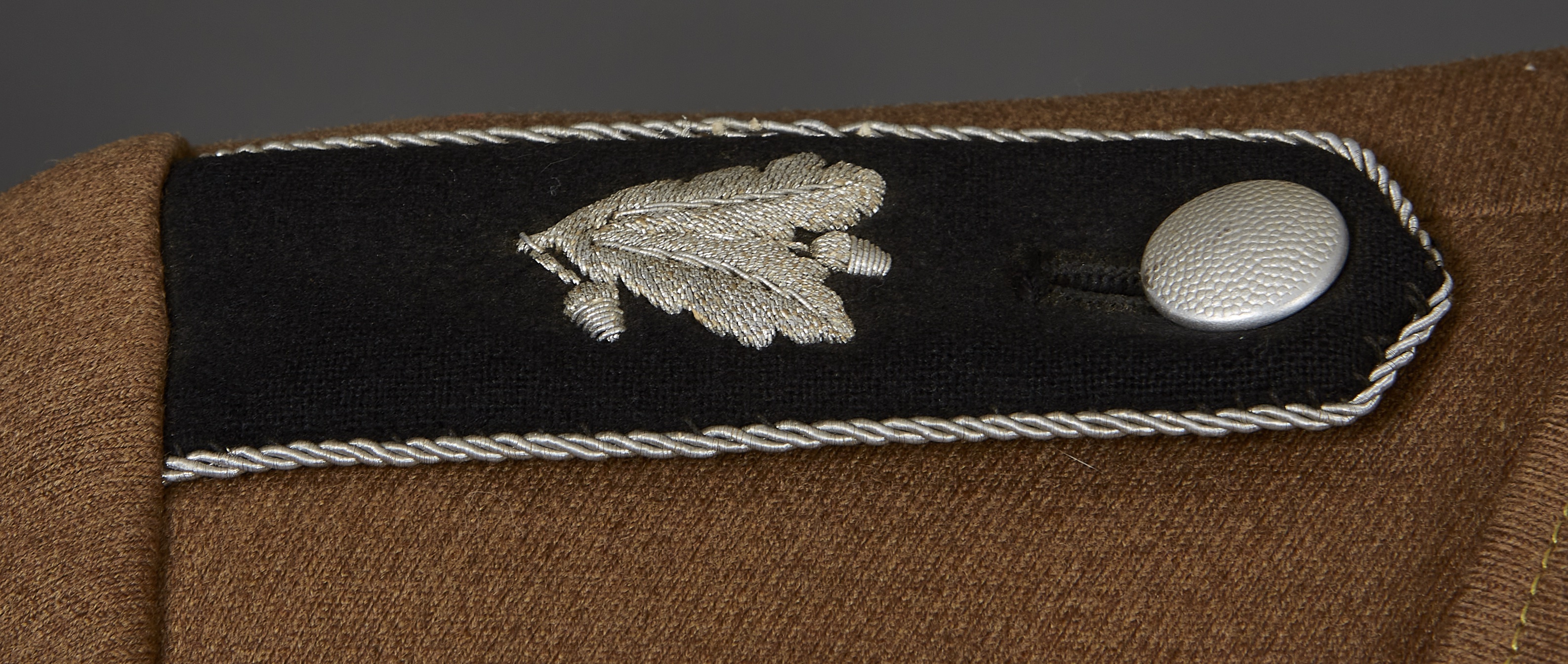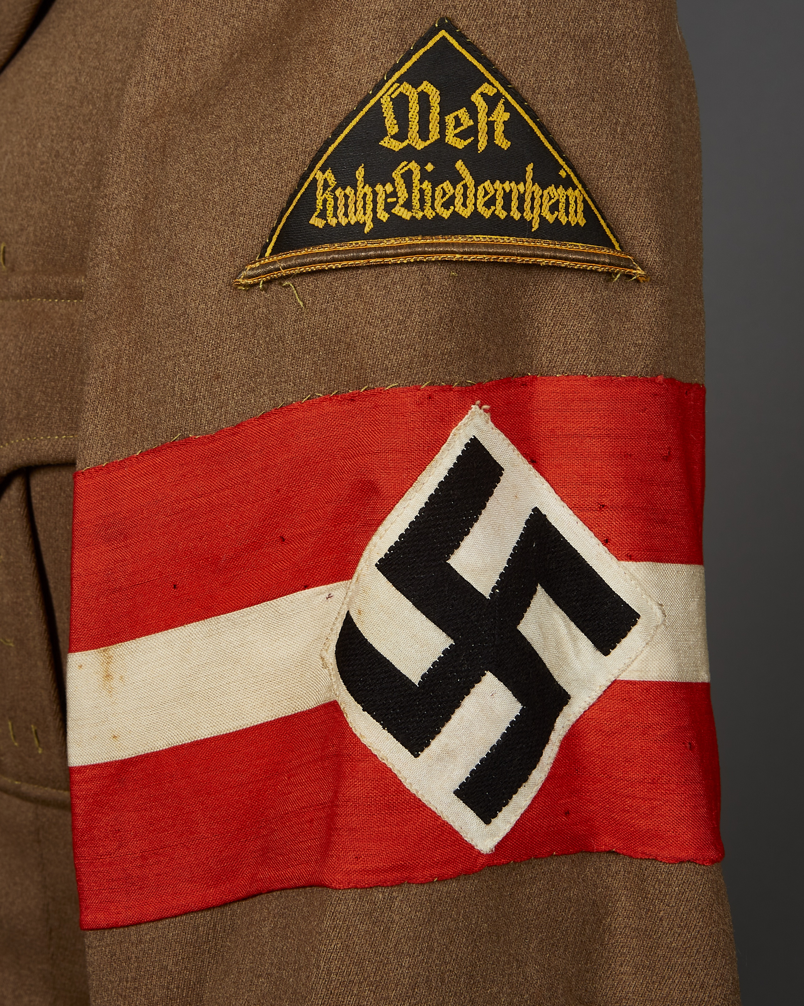 HJ Oberbannführer Service Tunic for West Ruhr-Niederrhein area. This tunic features slash pockets and numerous medal loops to both breast pockets as shown, along with tradition stripe to triangle indicating service prior to 1933. Excellent condition !