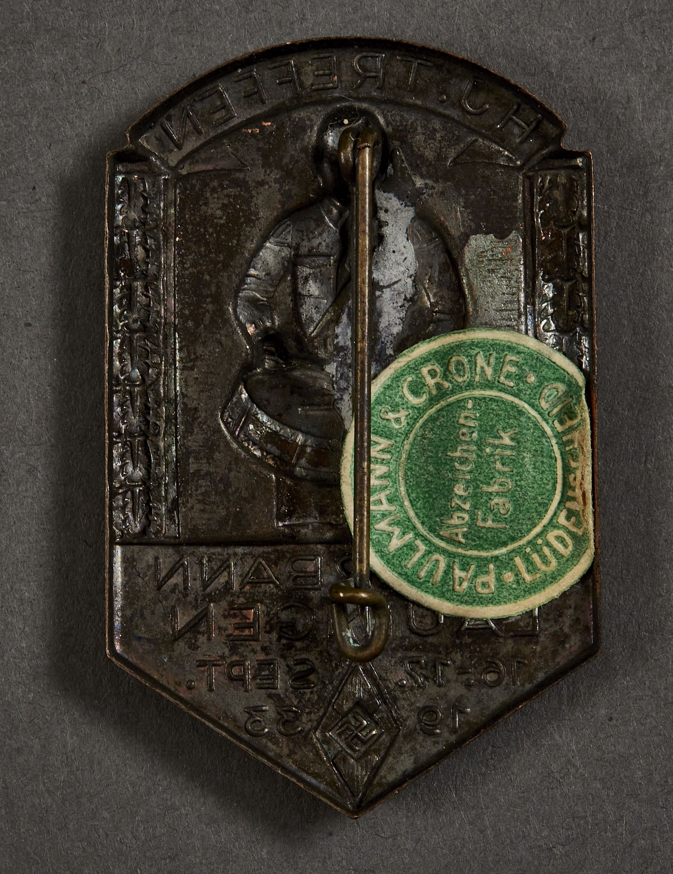 HJ Treffen Unterbann Lauingen 16.-17. Sept 1933 Tinnie, metal, paper maker marked, 30mm x 48mm