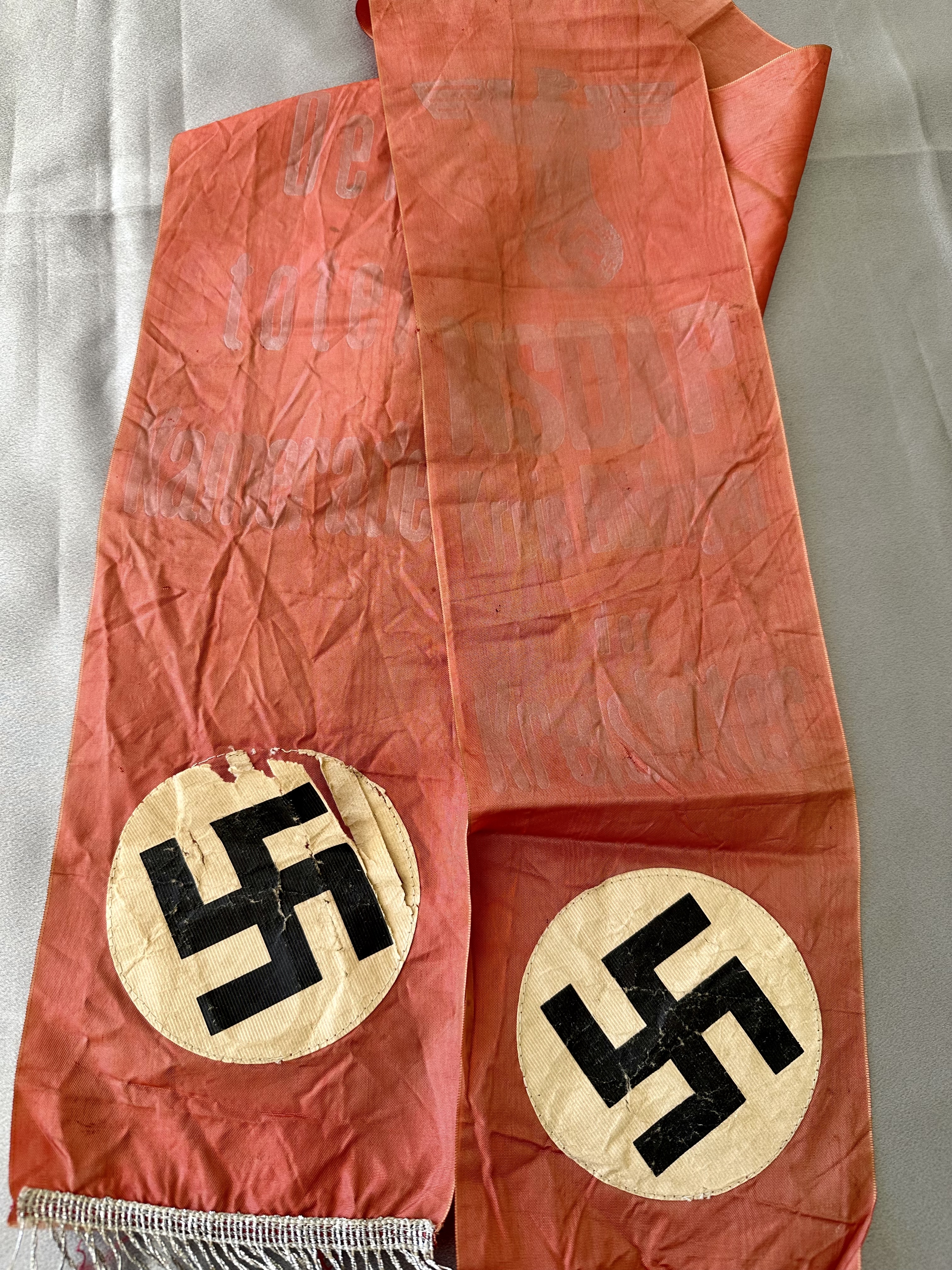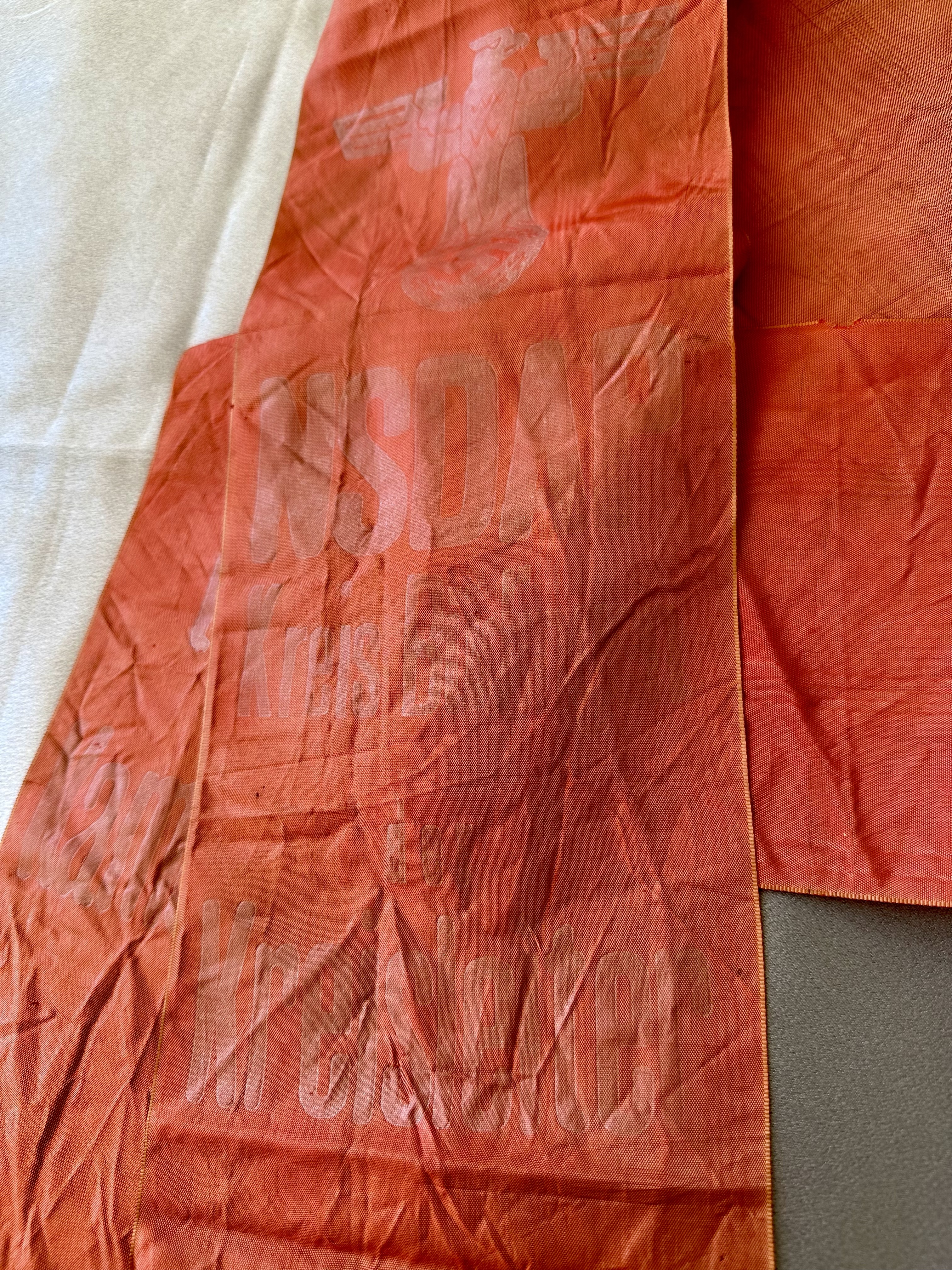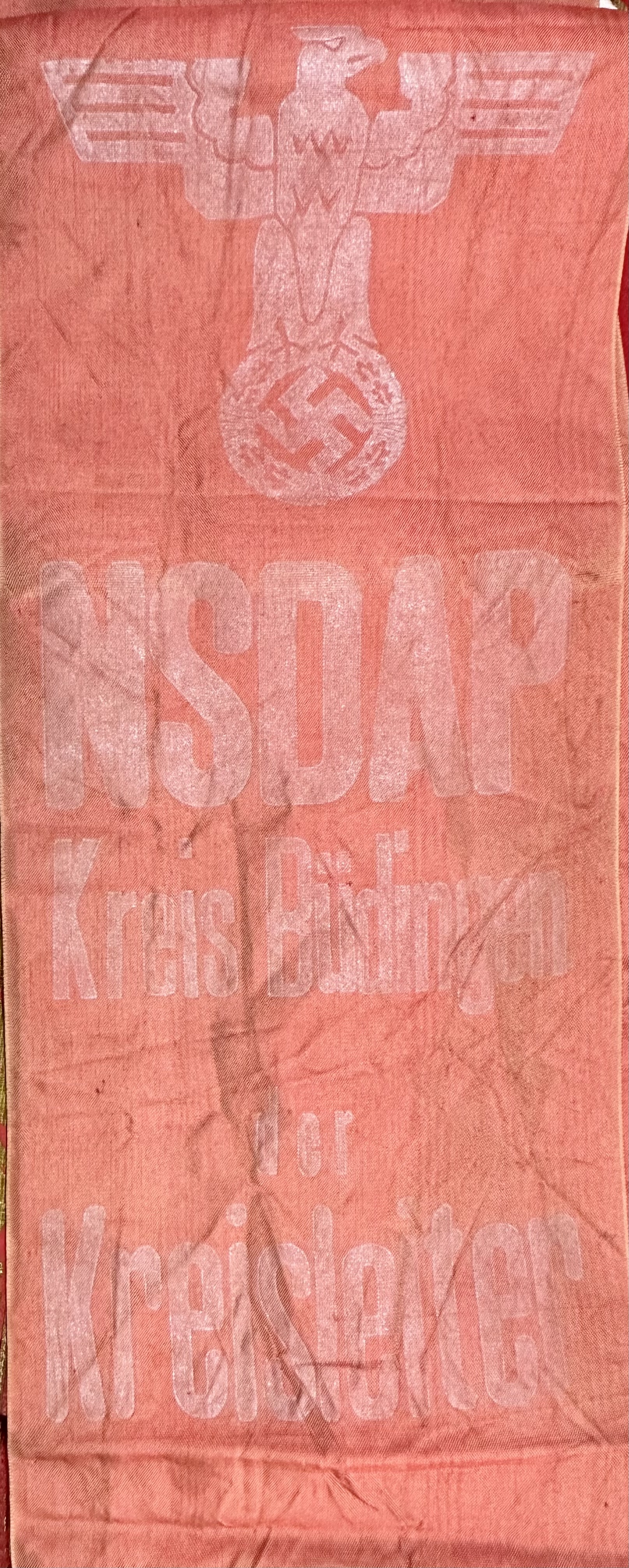 "NSDAP Kreis Büdingen der Kreisleiter". This would have been presented by the Kreisleiter of Kreis Büdingen. Full length of 6' X 6" in size, fading to print. RZM tag to reverse.