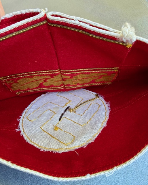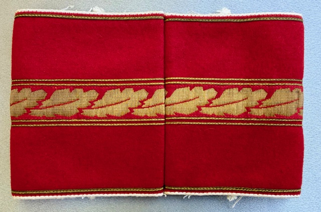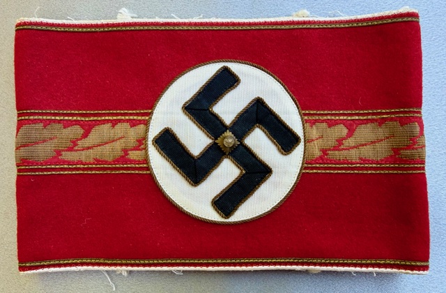 Armband for NSDAP Kreisleiter. Gold bullion oakleafs with black ribbon swastika and pip in the center. This one came off a tunic; sewn together, approx. 20" in length, excellent condition