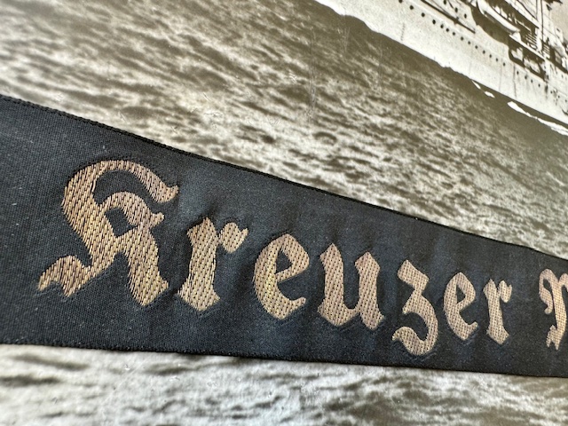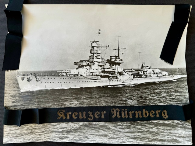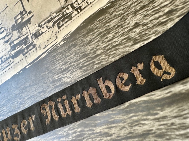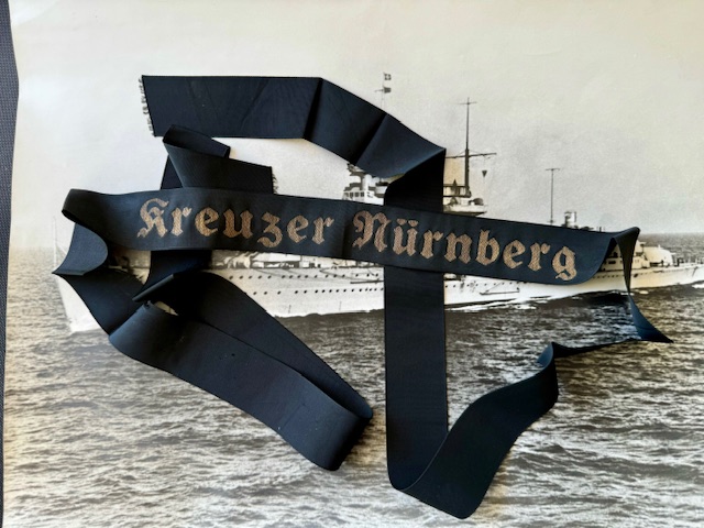 Kreuzer Nürnberg Cap Tally with period photo of the ship. Period photo is 15 1/2" X 11 3/4" in size, cap tally is just under 5 feet in length, both in excellent condition