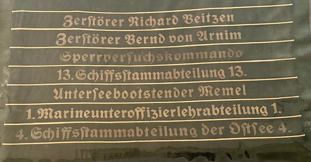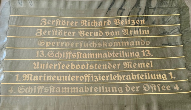 Kriegsmarine Cap Tallies. 7 different cap tallies sewn together as one piece for display, these include: Destroyer Richard Beitzen, Destroyer Bernd von Arnim, Blockade Squadron, 13 Ship Department, U-Boat tender Memel, 1 Marine NCO Training Office, and 4 Baltic Sea Department. Overall size is approx. 22" X 14" in size.