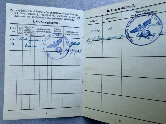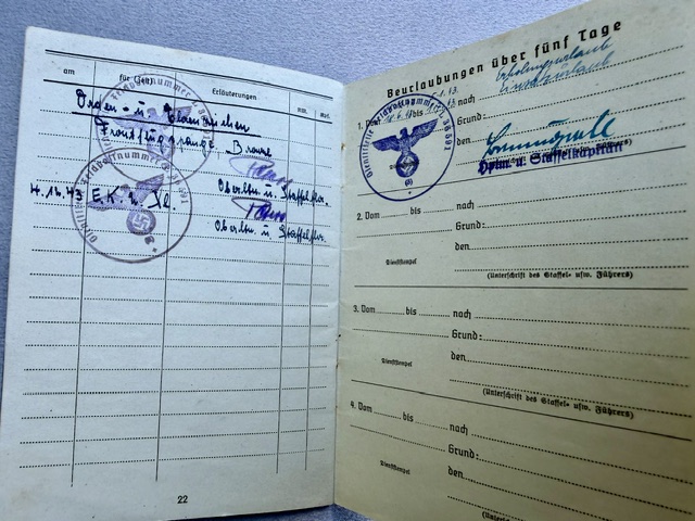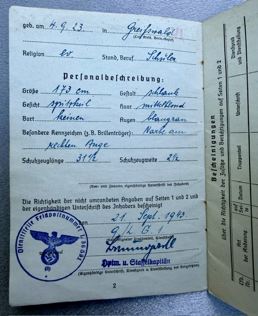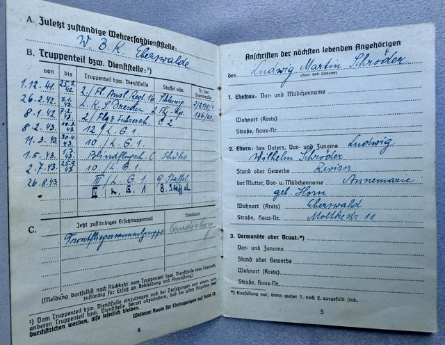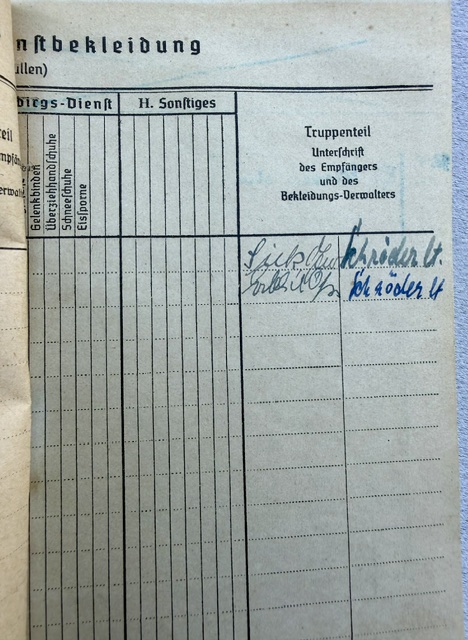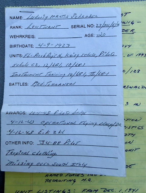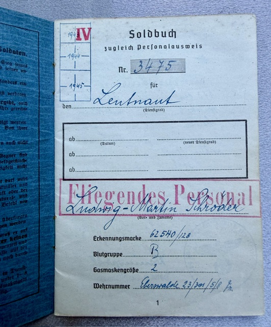 Lt Schroeder was a pilot of a JU-88A-4 L1+CS. He was awarded his pilots badge 30-7-43 was assigned to Unit III/L.G.1.9 Staffel then assigned to 8 Staffel. He was stationed in Crete, and his Staffel was a reconnaissance/anti-Shipping unit. He went on a night mission from Crete to Bari off the coast of Italy 12-12-43. Never returned from their mission , and were determined as MIA. Ended up they were shot down off the coast of Sicily by flak, and all crew lost. Lt Schroeder pilotBeobachtet. Unteroffizer Josef HardtBordfunker. Unteroffizer Heinz FriedrichBordschutze. Unteroffizer Gottfried Spalt4-12-43 Schroeder was awarded the EK2 and Bronze Operational Flying Clasp. The 2 award entries were signed by German Cross and Knights Cross recipient Karl Peter’s. Plus, on page 23 it has another signature by Erich Baumgartl who won the German Cross, Knights Cross, and Honor Goblet with 3./KG-55 that was renamed 9./LG-1 Schroeders 1st unit. So 2 KC winner’s signatures. A precious piece of WW2 history!
