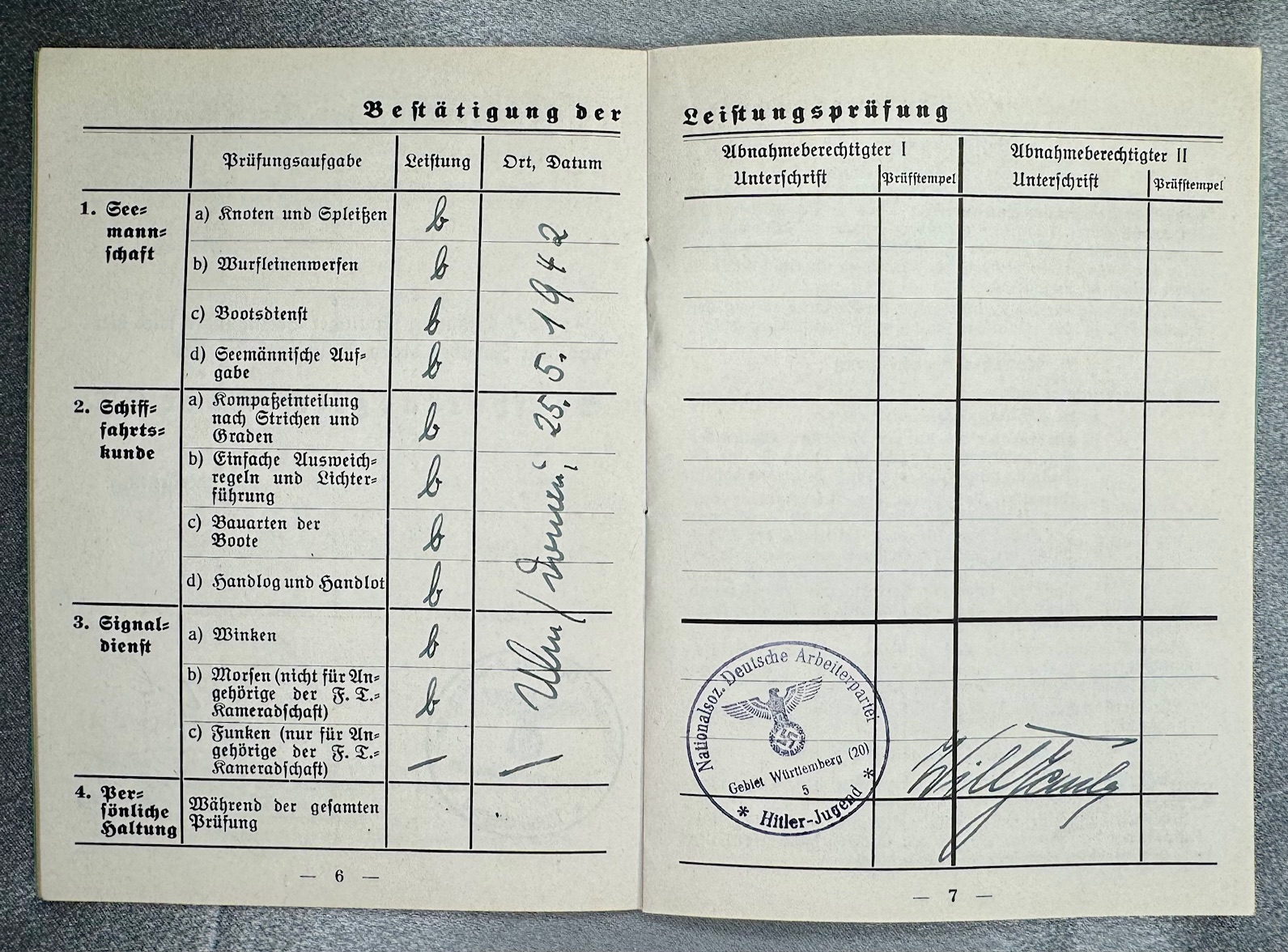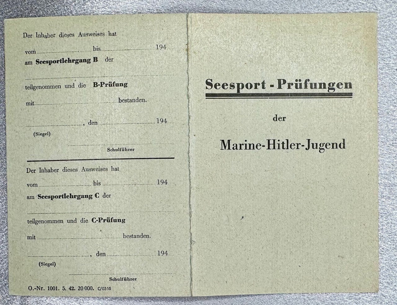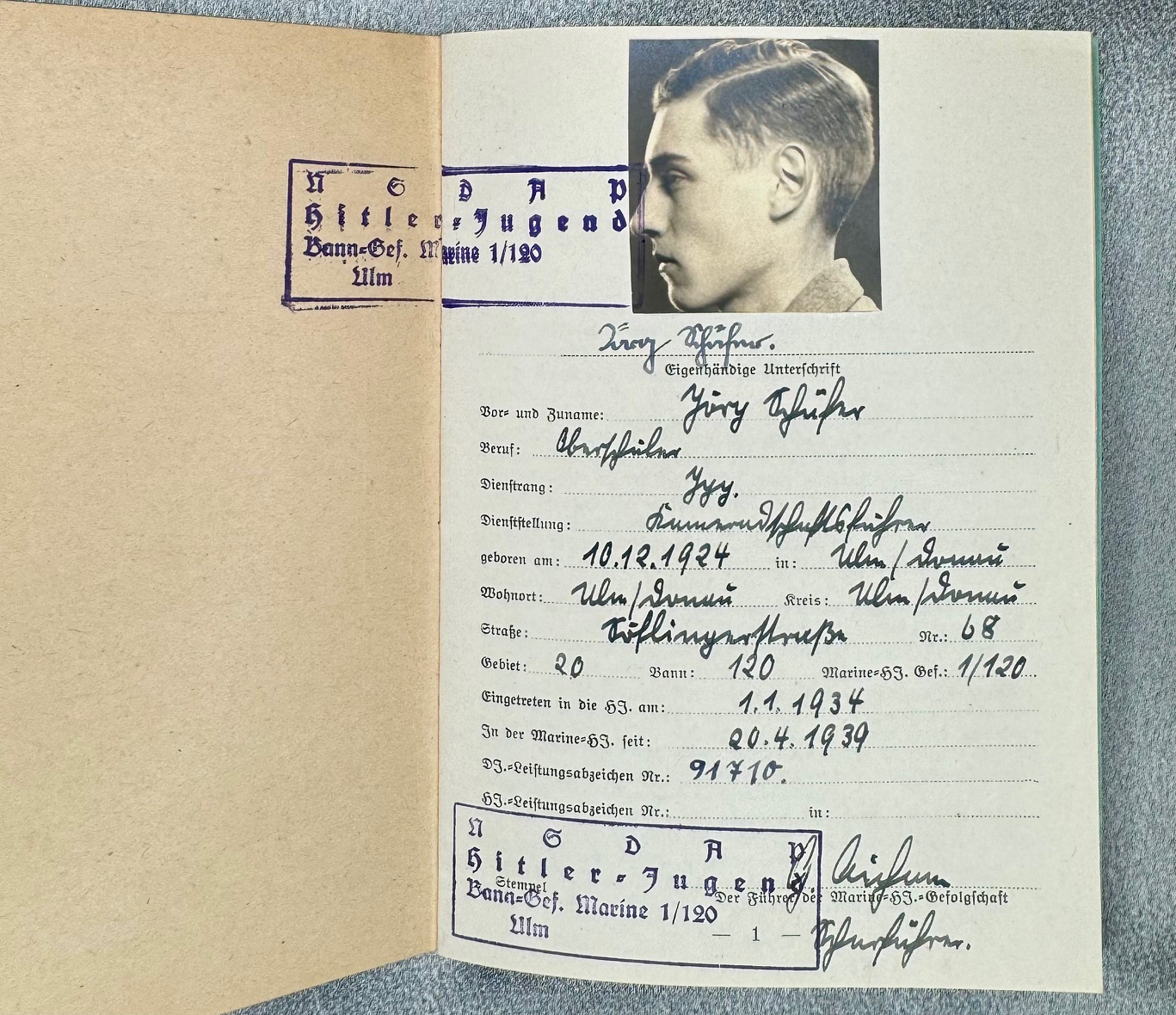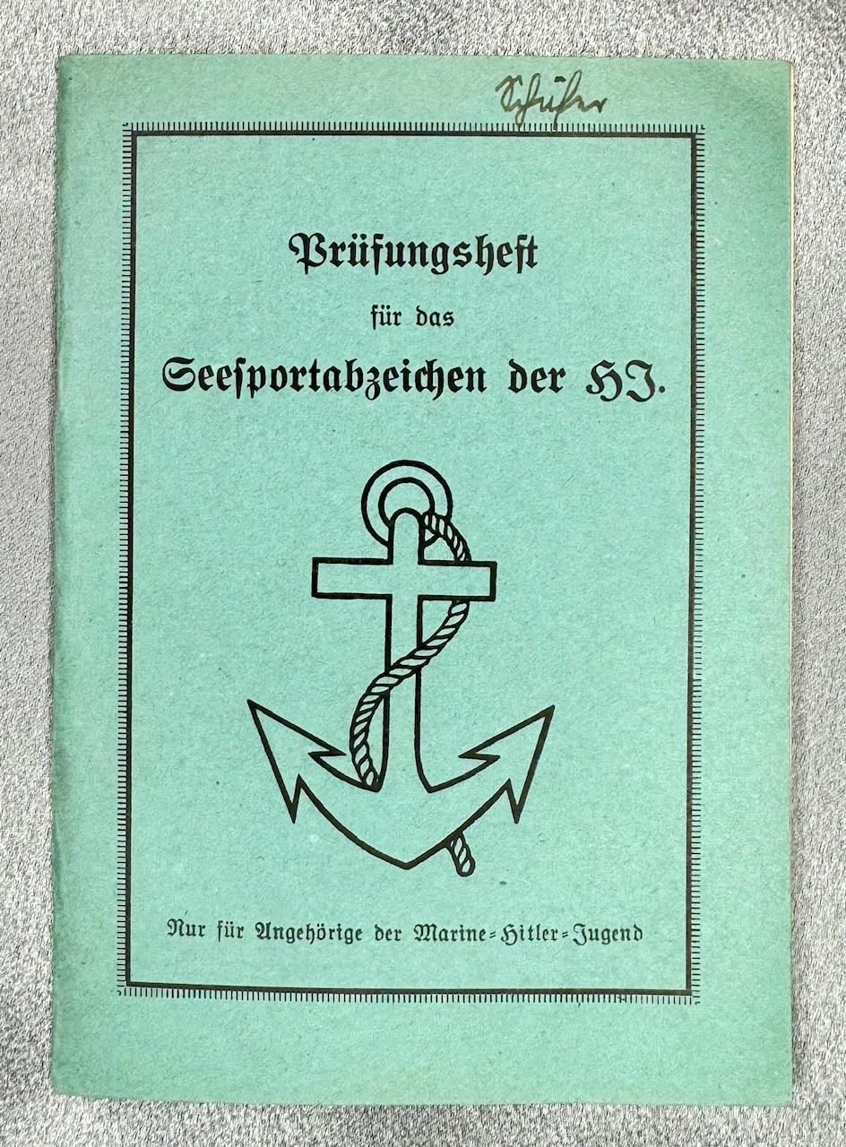 Three documents for Oberrottenfuhrer Jorg Schafer of Ulm for Marine HJ Bann Ulm 1/120 to include his Fuhrerausweis der Hitler-Jugend, Seesport Prüfungen der Marine Hitler Jugend, and his Prüfungenshest fur das Seespotabzeichen der HJ. Rare to find all 3 to one Marine Hitler Youth