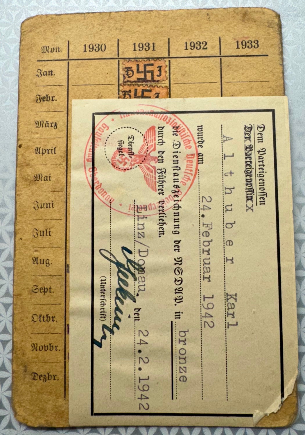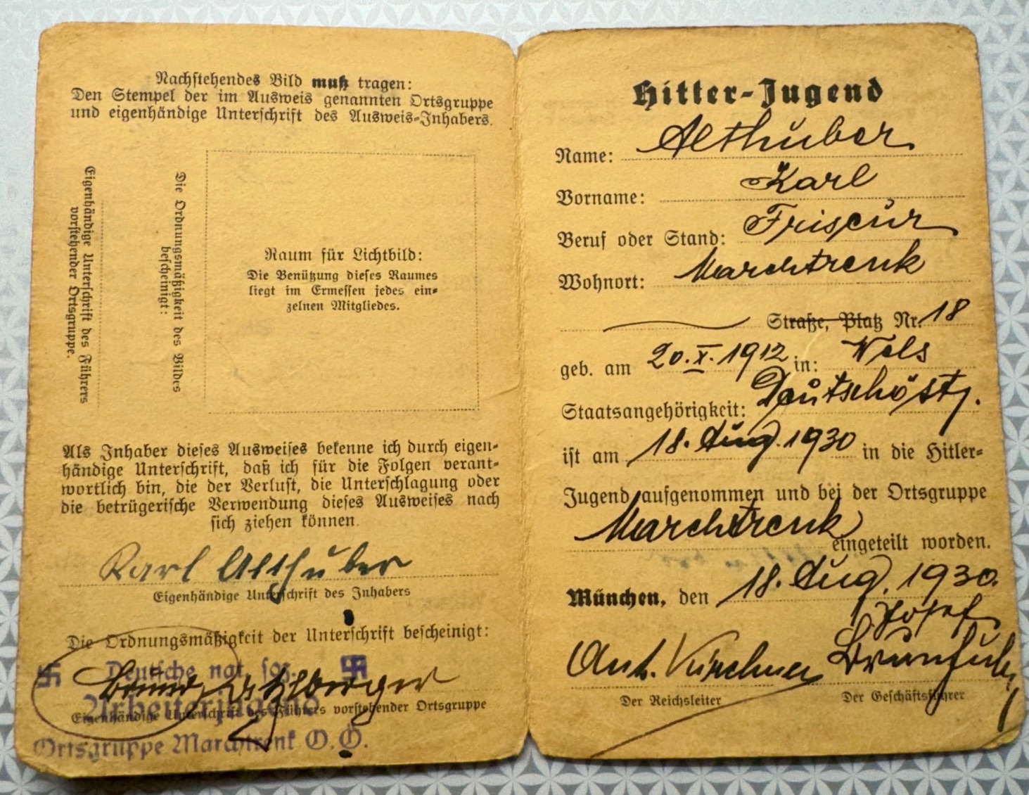 Mitglieds-Ausweis der Hitler Jugend to HJ Leader Karl Althuber. He joined August 18, 1930, card shows he was awarded the NSDAP 10 year long service award on February 24, 1942. Photo missing