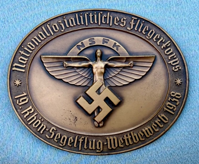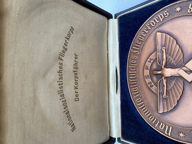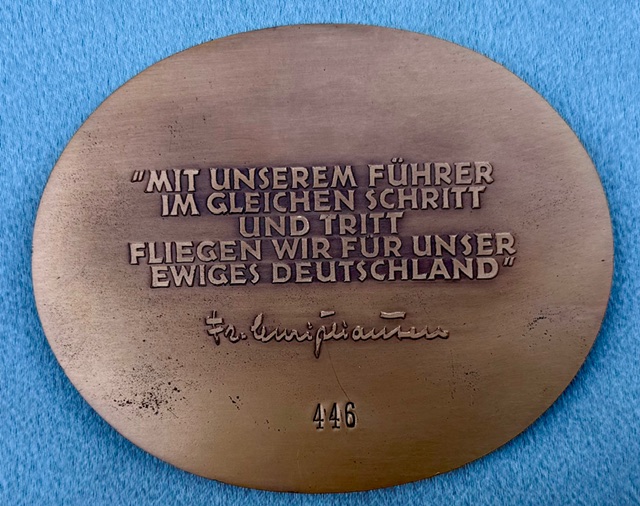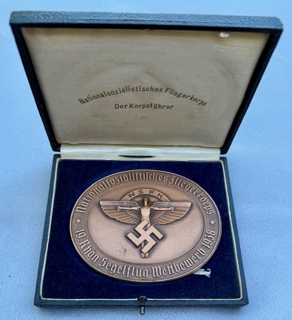 “Nationalsozialistisches Fliegerkorps 19. Rhön-Segelflug-Wettbewerb 1938” , indicating this was awarded for achievement in a glider competition. The reverse inscription translates to “In lock step with our Führer, we fly for our eternal Germany,” with the signature of NSFK leader General der Flieger Friedrich Christiansen and numbered "446". Medallion is approx. 95mm x 77mm, case is in excellent condition.