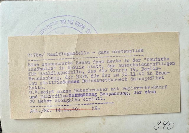 Indoor flight models are quite astonishing. An interesting event was held today in the Deutschlandhalle in Berlin, the qualifying flight for indoor flight models, which the Group IV Berlin-Brandenburg of the NSFK had organized for the national competition taking place on November 30, 1940 in Breslau. U.B. shows a helicopter with a paper tube fuselage and microfilm covering, which achieves a climb height of about 20 meters. Press photo, approx. 5" X 7" in size.