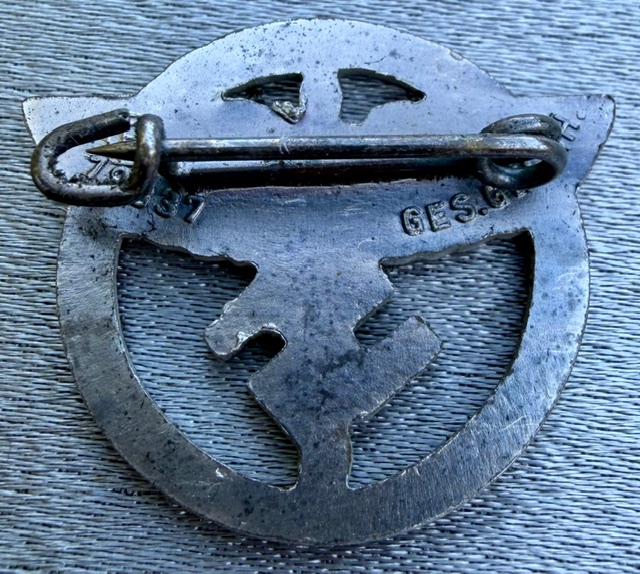 NSFK Membership Badge, early one maker marked with "ges gesch 18837" to reverse