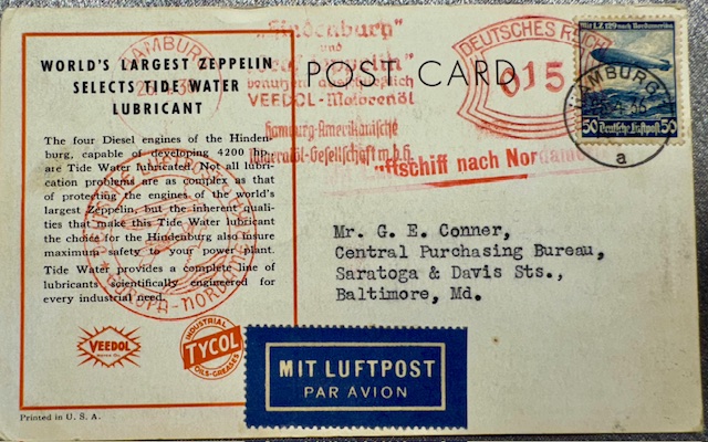 On Board The Hindenburg Postcard, mailed on April 25, 1936 to a US address