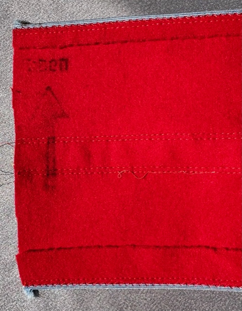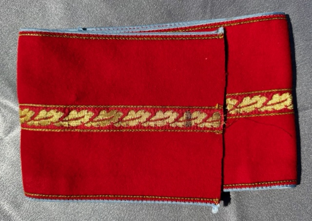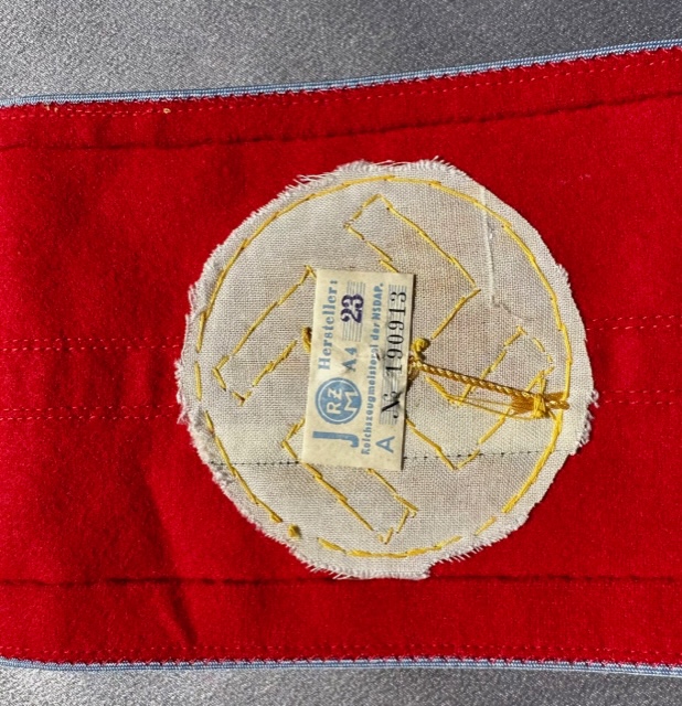 Orstgruppe Zellenleiter Betriebsobmann (C & D) Hauptbetriebsobmann Armband. Multi-piece red wool with central, white, ribbed rayon circular field with canted, black rayon tape swastika. Both white circular field and swastika bordered in gold thread and swastika has an alloy political style rank pip to center. Applied to center is a machine woven, horizontal strip of repeating gilt 13mm cellion oak-leaves, with 1 mm gilt wire piping. Top and bottom of armband is bordered in light blue rayon piping with a secondary 1mm gilt wire piping inset from outer edges. Complete with paper RZM tag, approx. 21" long. Choice example !