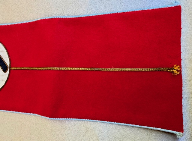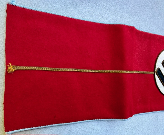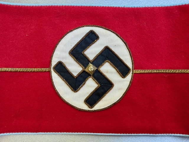 The hardest Orts level armband to find at the Operational level. Ortsgruppe Blockhelfer (Block Assistant) or Betriebsobmann (Factory Official). Single 3 mm gold ribbon stripe running through the center of the red field with gold metal political pip to center of the swastika. Blue piped with gold trim to swastika. Ink stamp "oben", just over 20" in length. Mint condition.