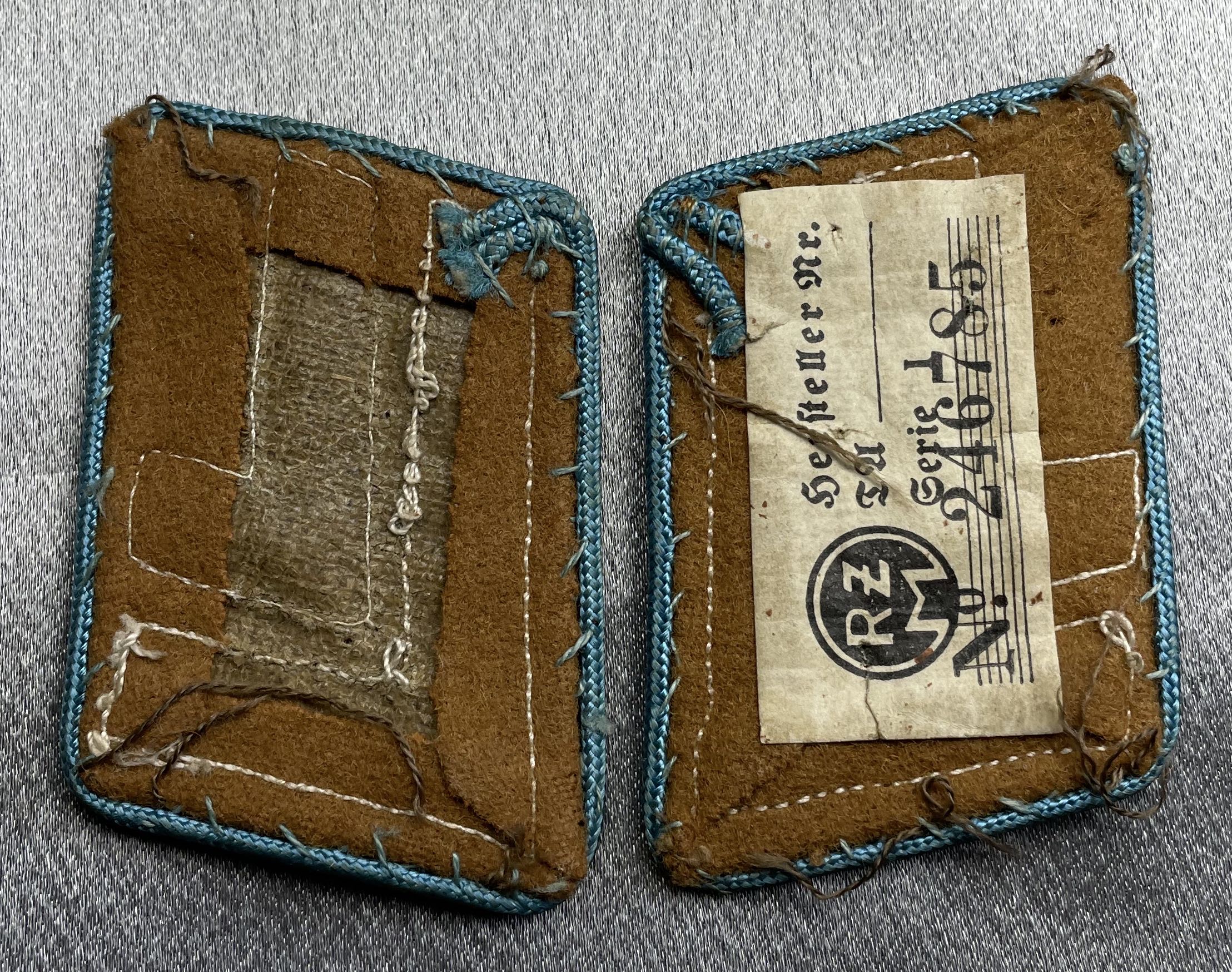 Ortsgruppe Hauptstellenleiter Tabs. Nice pair of second pattern Orts level Hauptstellenleiter tabs. Double L shaped 10mm silver bars with interwoven swastikas, piped in blue.