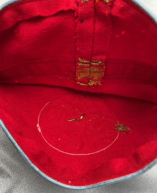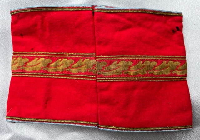 Armband for NSDAP Ortsgruppenleiter, highest leader at the Orts level. Bullion oakleafs with black ribbon swastika and pip to center. This armband is sewn at the back, came off a tunic, good condition.
