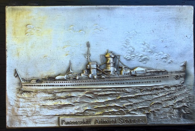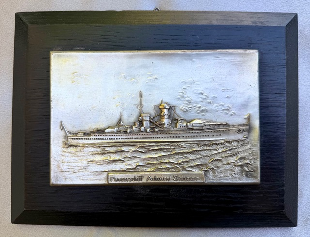 Panzerschiff Admiral Scheer Plaque, metal mounted on wood with hanger, approx. 8 1/4" X 6 1/4"