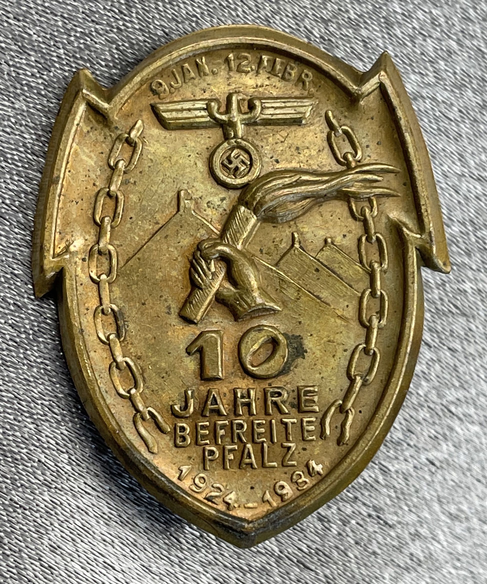 9. Jan.-12. Febr. 10 Jahre befreite Pfalz 1924-1934 in bronze metal, pinback.