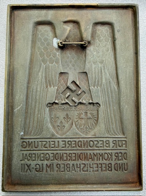 "Für Besondere Leistung der Kommandierende General und Befehlshaber im LG XII" , metal with hanger to the reverse, approx. 4 1/4" X 5 3/4"