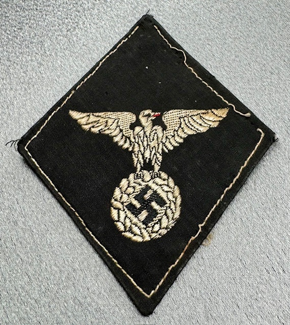 Political Leader Sleeve Eagle, diamond shape machine woven silver-gray national eagle with black swastika and red beak. Worn on the upper sleeve by all Political Amtswalters. This one came off a shirt, nice condition.